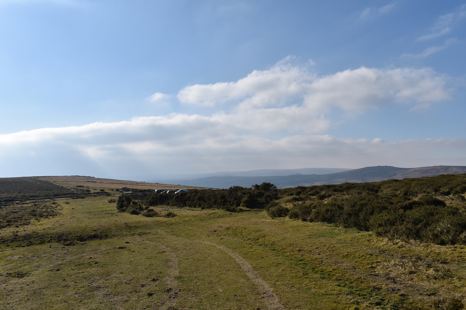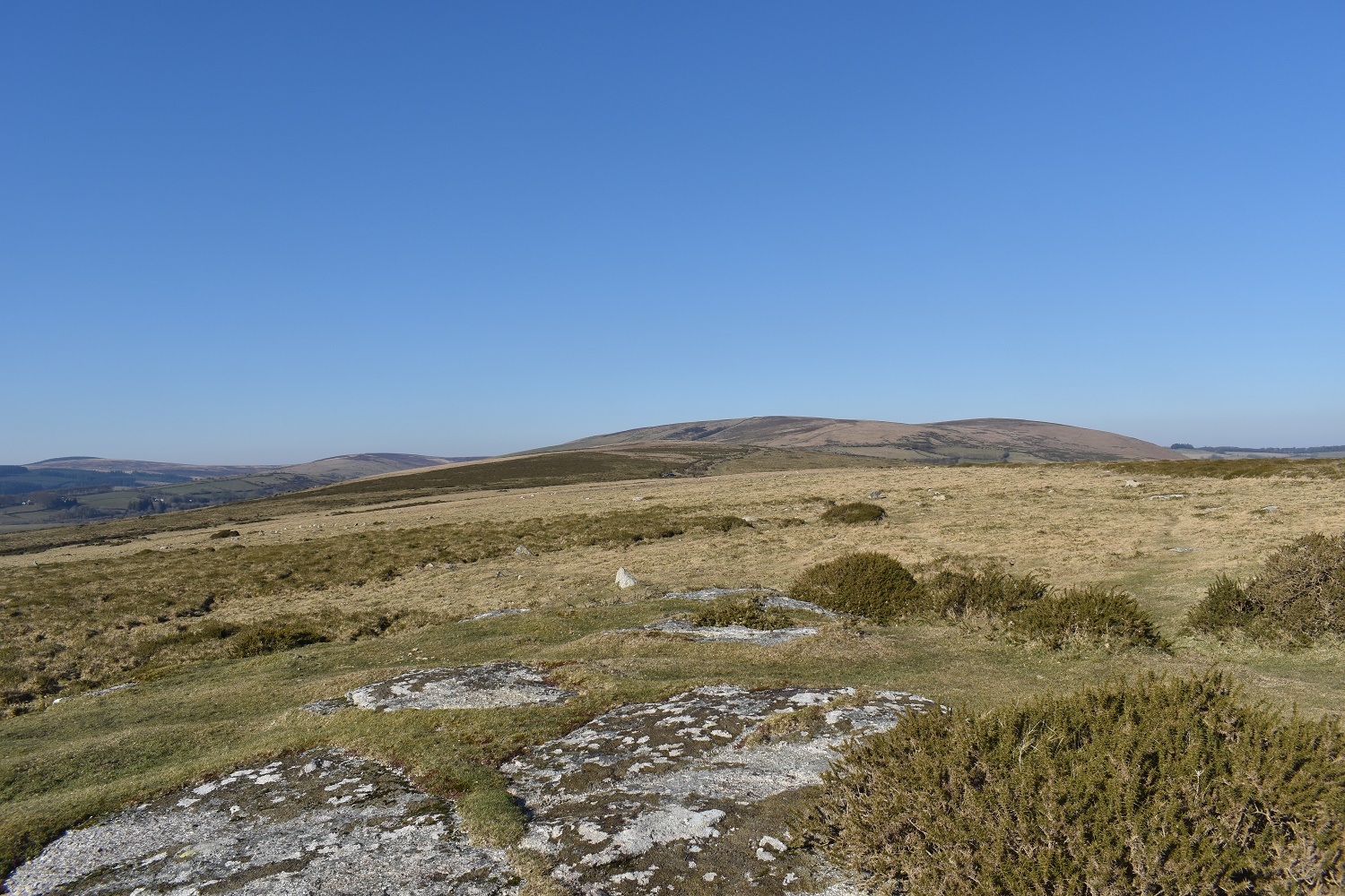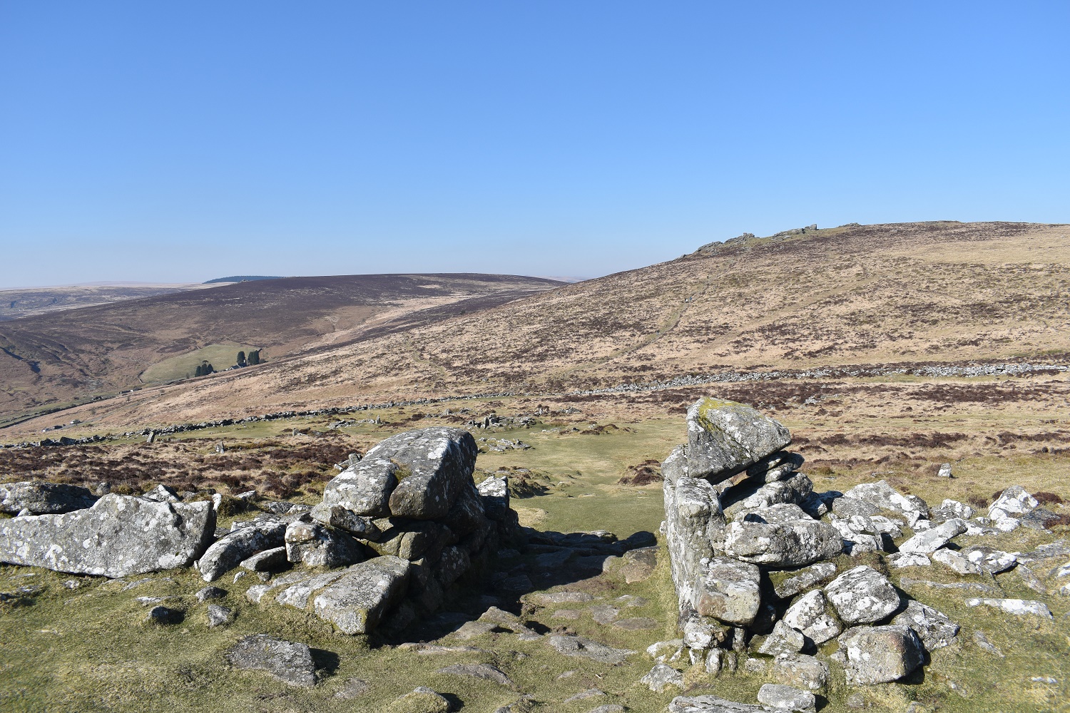 The circular wall down there is Grimspound, a bronze age settlement, likely older than Stonehenge. Hookney Tor rises up behind
