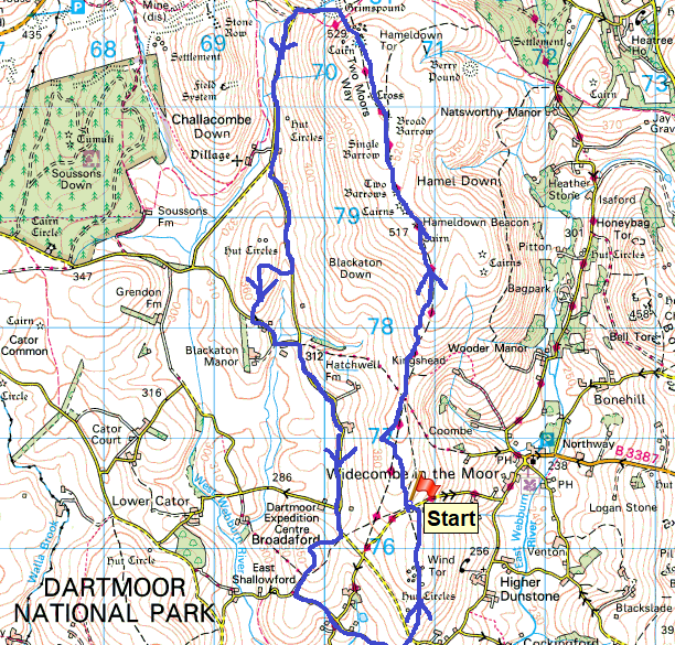 | Route – Langworthy Tor – Stoneslade Tor – Kingshead Tor – Hameldown Beacon – Broad Burrow – Hameldown Cross – Hameldown Tor –Grimspound – Blacka Tor – Rowden Tor – Drywell Cross – Wind Tor – Widecombe parking |