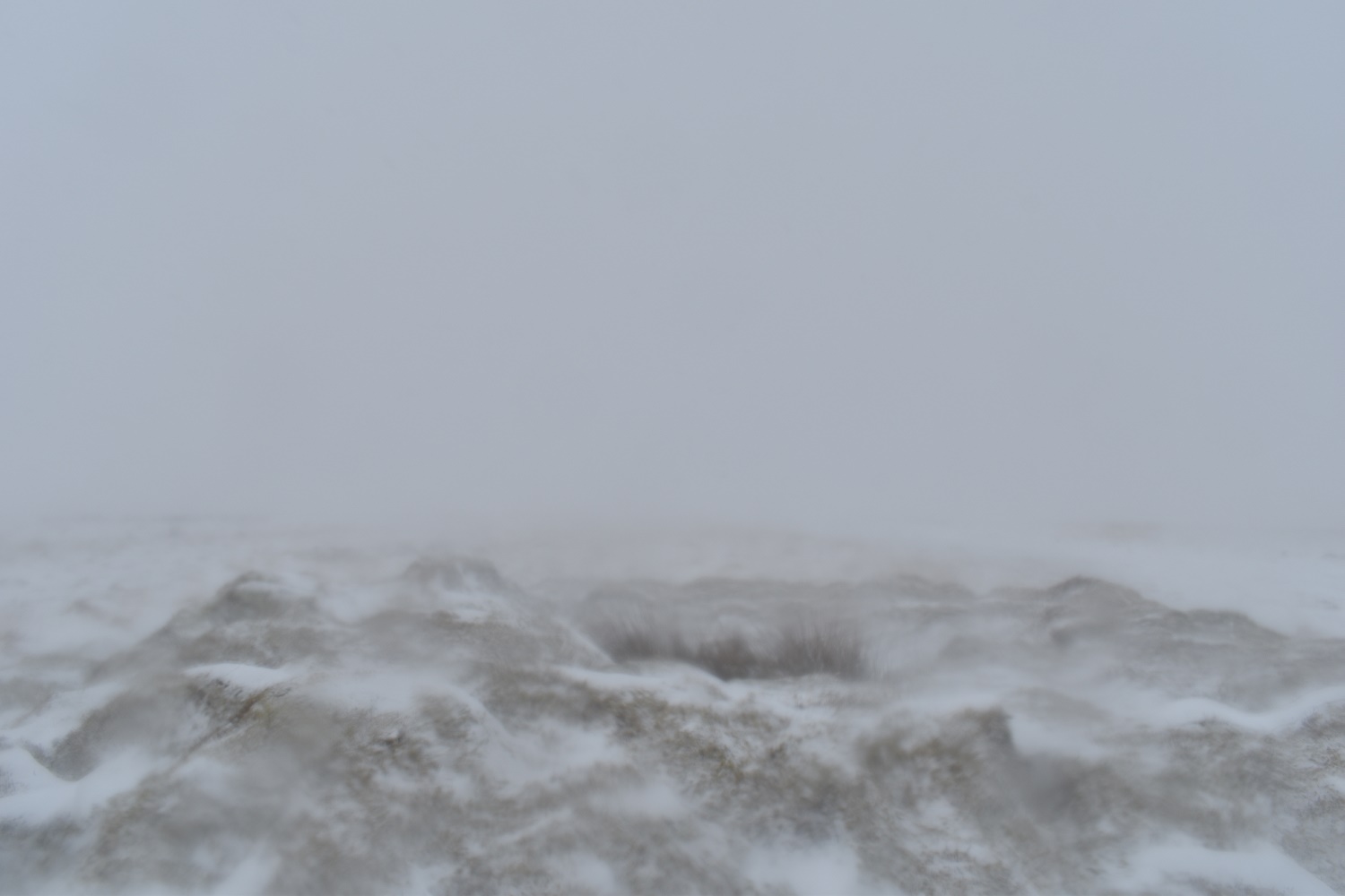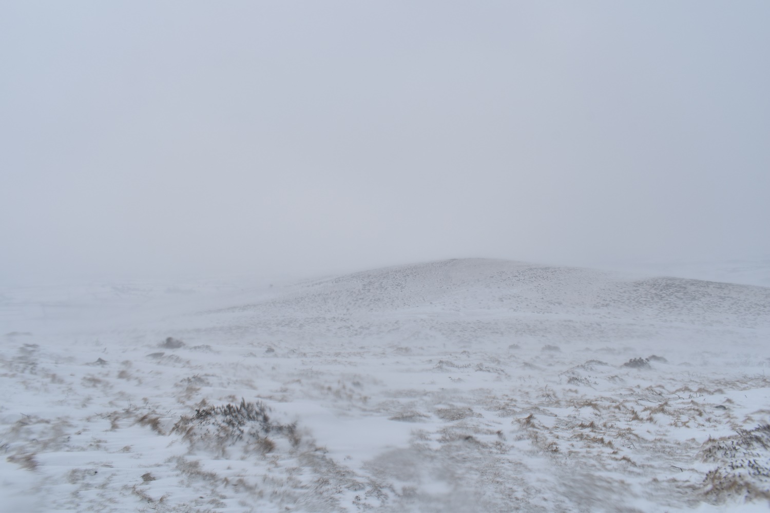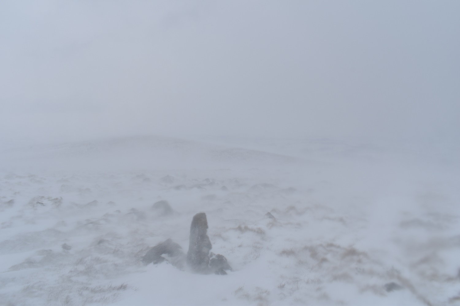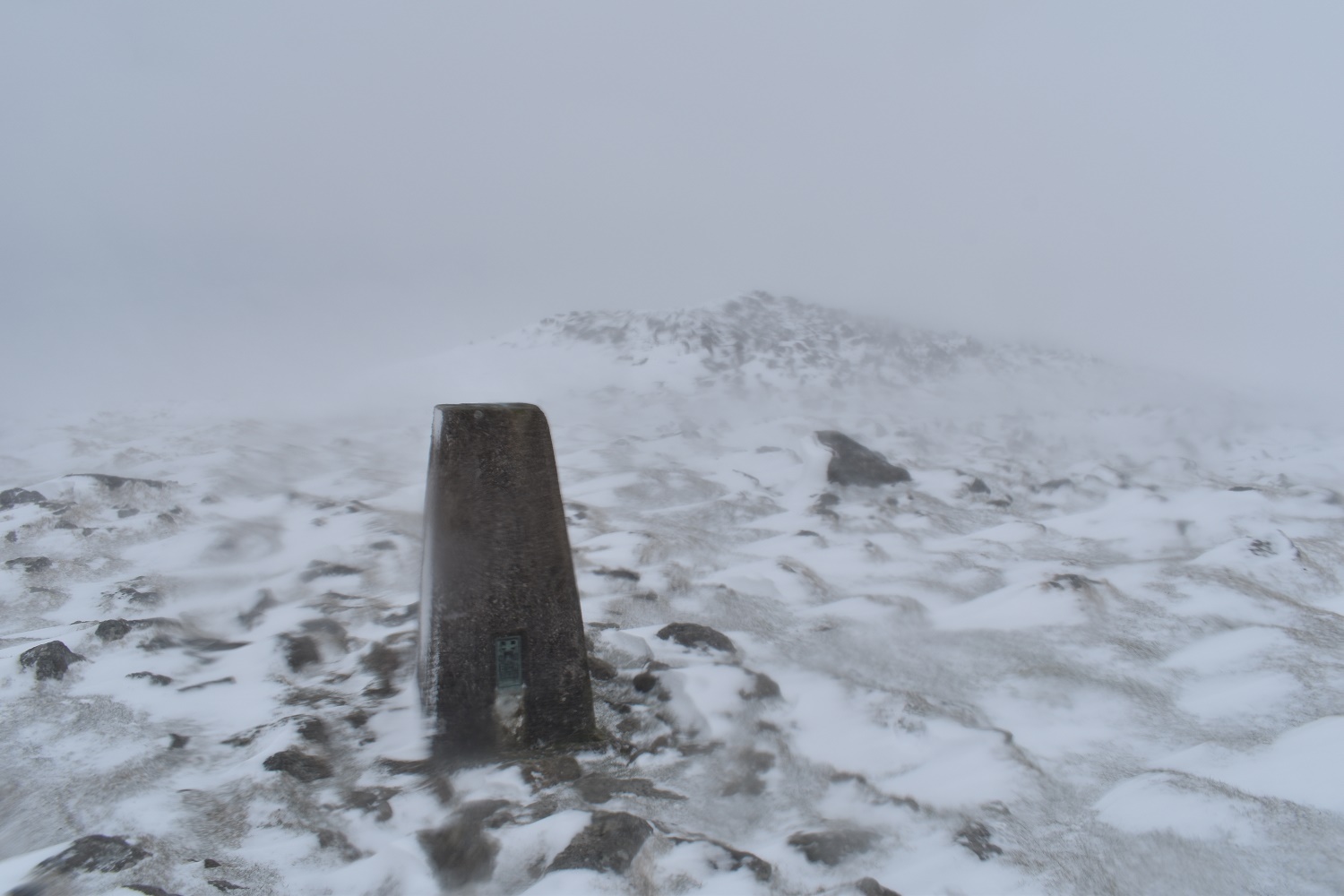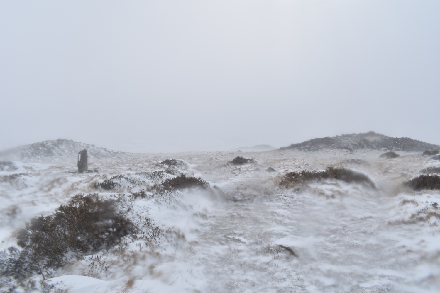 Piles Hill and the high point of the walk. I had planned on going on to Three Barrows but another 80 metres of ascent would have been stupid. The snow was whipping against my face and I really needed some goggles for these conditions, visibility was down to 10 metres at best