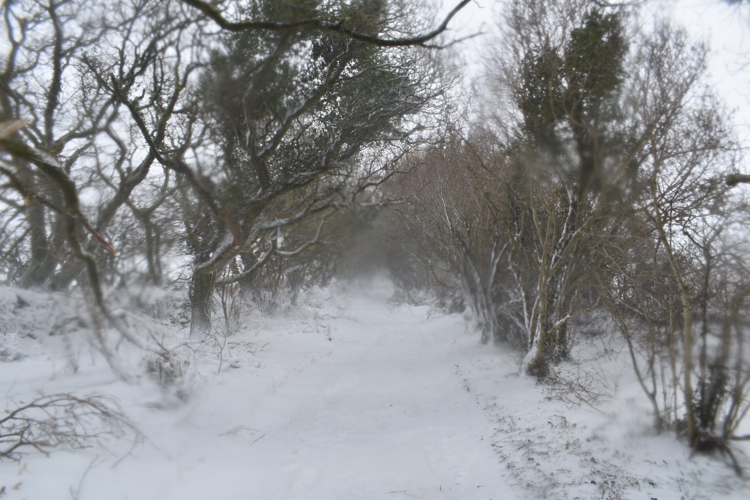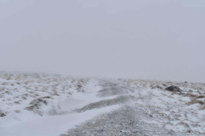 Driving up here today was possible at this time (I’d already been up for a look in the car) however in a couple of hours I reckoned the lane would be full of snow, so I didn’t risk it. The gate at the end of this lane was like entering a different world of wild weather
