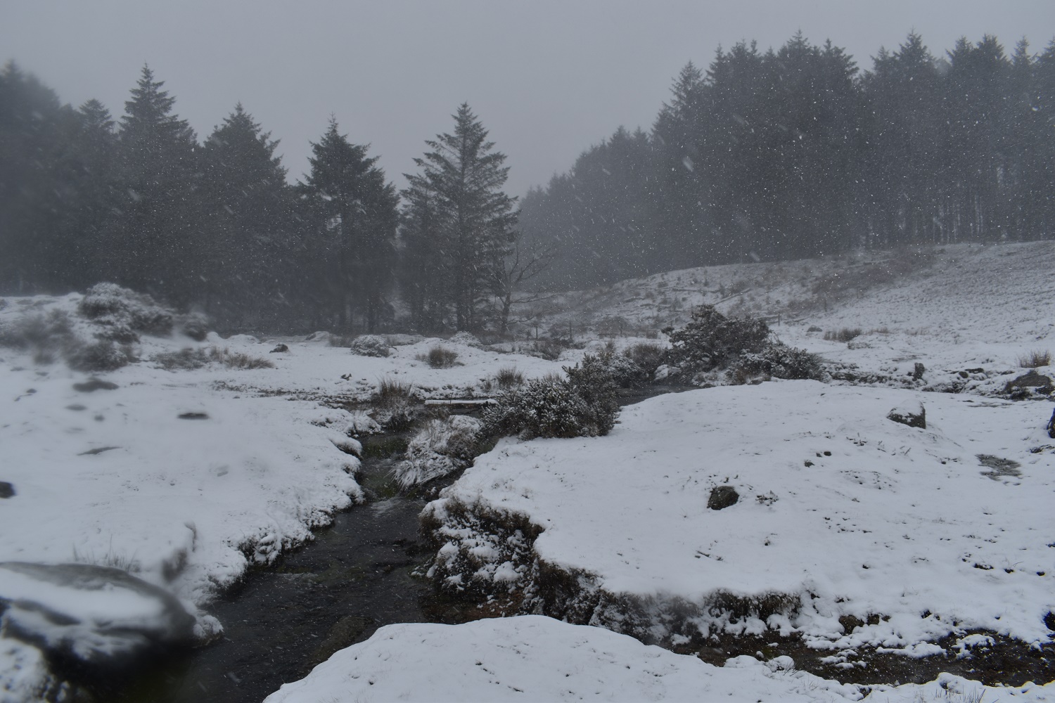 The outflow from the reservoir, I took refuge and some shelter under the trees over there. Had a drink and something to eat. I was aware that the trudge up to Piles Hill from here would be long and against the snow and wind