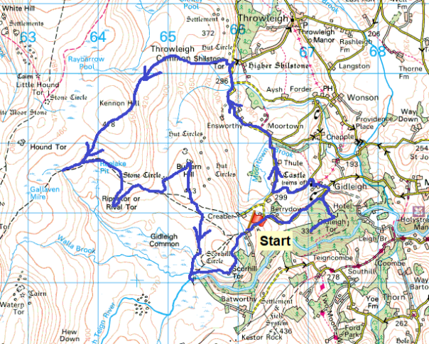 | Route – Gidleigh Tor – Gidleigh – Moortown – Shilstone Tor – Kennon Hill – Gallaven Ford – Rival Tor – Buttern Stone Circle – Buttern Hill – Scorhill Stone Circle – Walla Brook Clapper Bridge – Teign-e-ver Clapper bridge – Tolmen Stone – Scorhill Tor – Gidleigh parking |