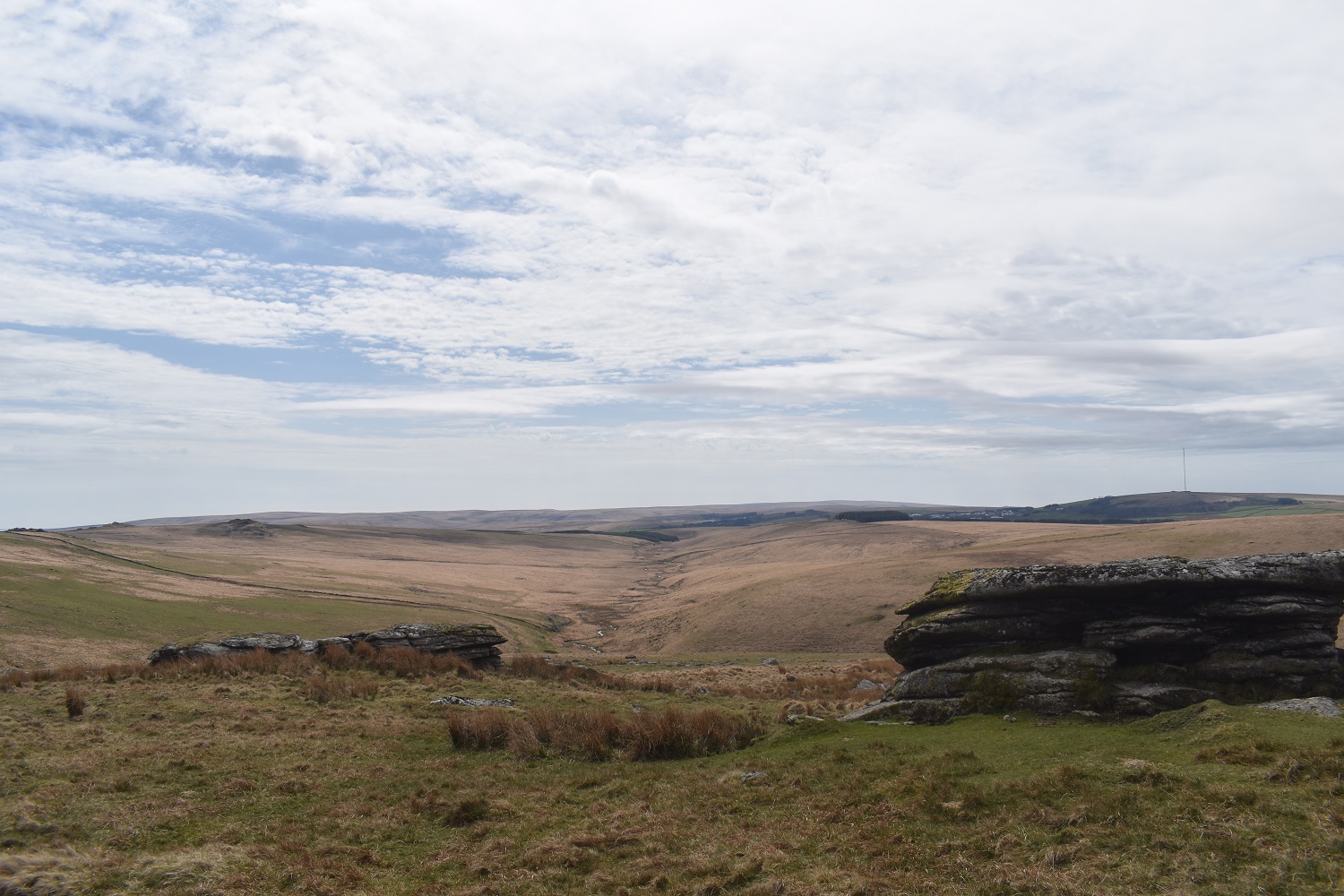 There are three outcrops on Beardown, and a couple of huts also. That’s the Cowsic valley down to the left