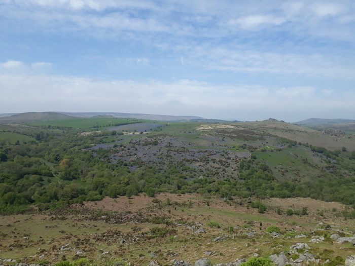 Road closures due to the Plymouth half marathon meant I was cut off from the north and west of the city. This meant a drive around the back roads to Ivybridge where I figured that I might as well continue along the A38 and go to the area around Haytor. This also meant a chance to see the Holwell bluebells, if they were in bloom, which they were and then some. This area can be very busy but this route stayed away from the honey pots of Haytor and Hound Tor and gave a little peace and quiet. The other side to this area is the number of tors that can be bagged in one hit, I gathered 19 on this walk, but without too much more effort you could easily go for another 5. This was also my last walk before heading to the Lakes and I was looking for plenty of descent and re-ascent to get the legs going and whilst I will never replicate the steep hills up there, the walk up to Greator Rocks is a tough slog. All in all a fine day out where the star of the show wasn’t the views or the tors but a little flower and a carpet of blue and purple.