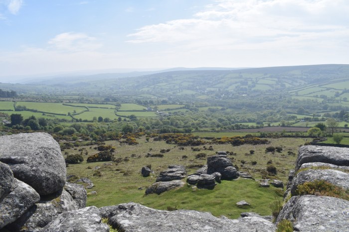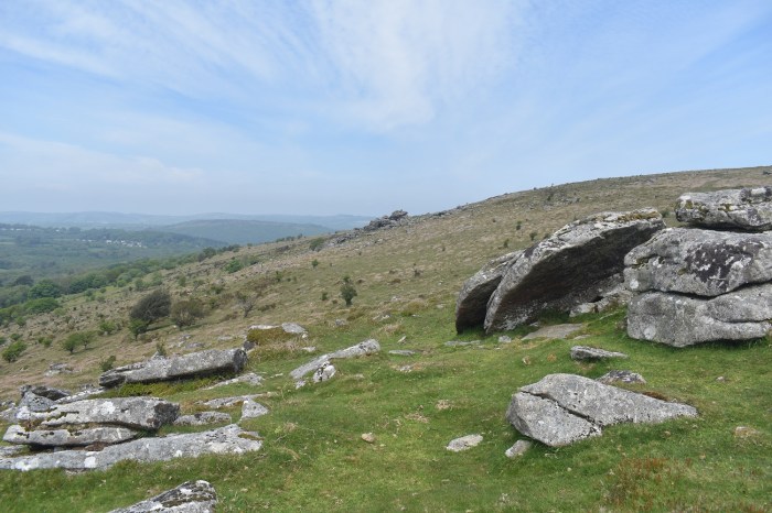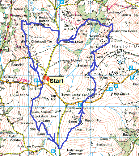| Route – Lower Top Tor – Shovel Stone – Hollow Tor – Tunhill Rocks– Wittaburrow – The Nutcrackers – Rippon Tor – Saddle Tor – Emsworthy Rocks – Holwell Tor – Haytor Tramway – Smallacombe Rocks– Hole Rock – Leighon Tor – Becka Brook bridge – Greator Rocks – Holwell Lawn – Hedge Tor – Honeybag Tor – Chinkwell Tor – Bell Tor – Bonehill Rocks – Top Tor parking |