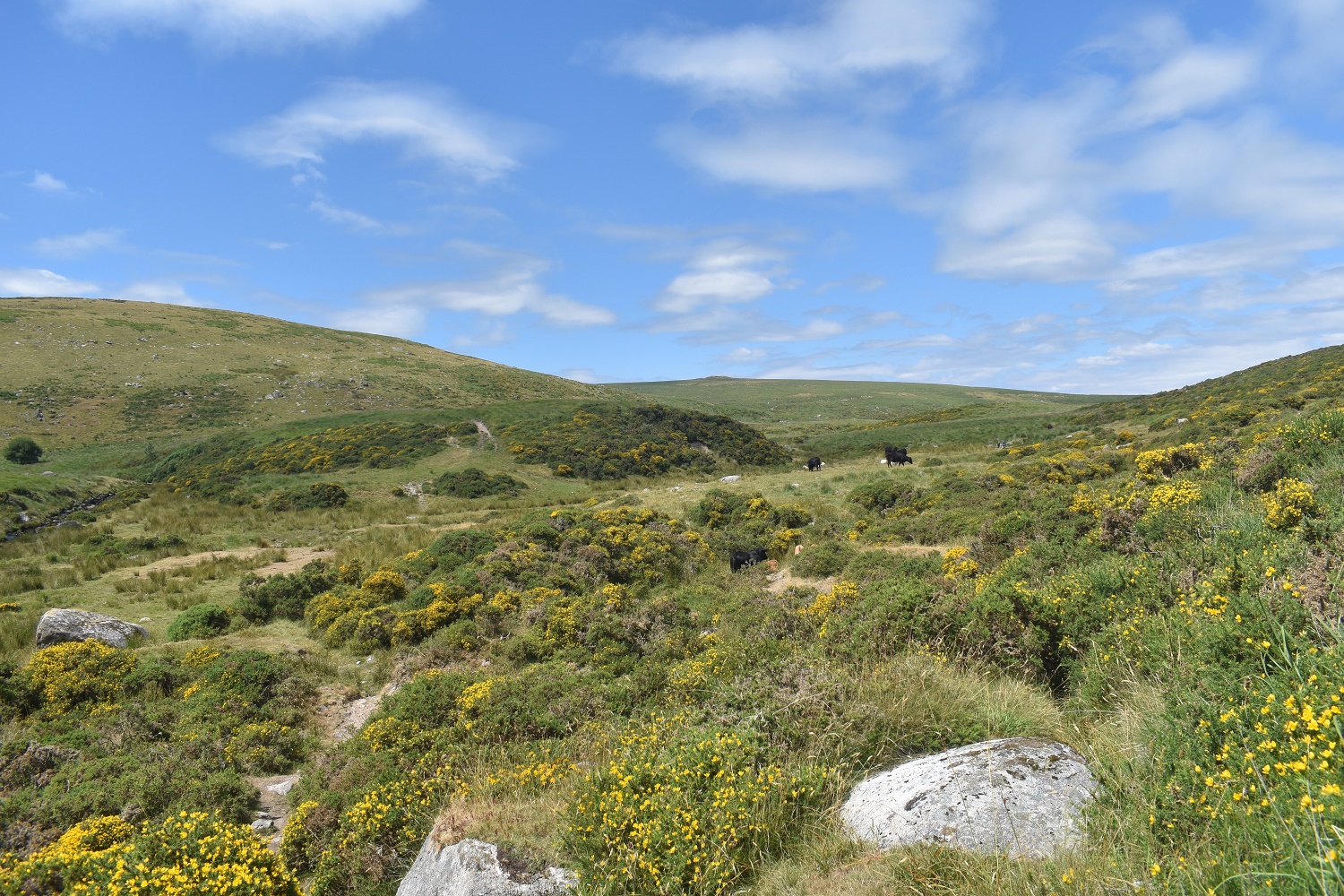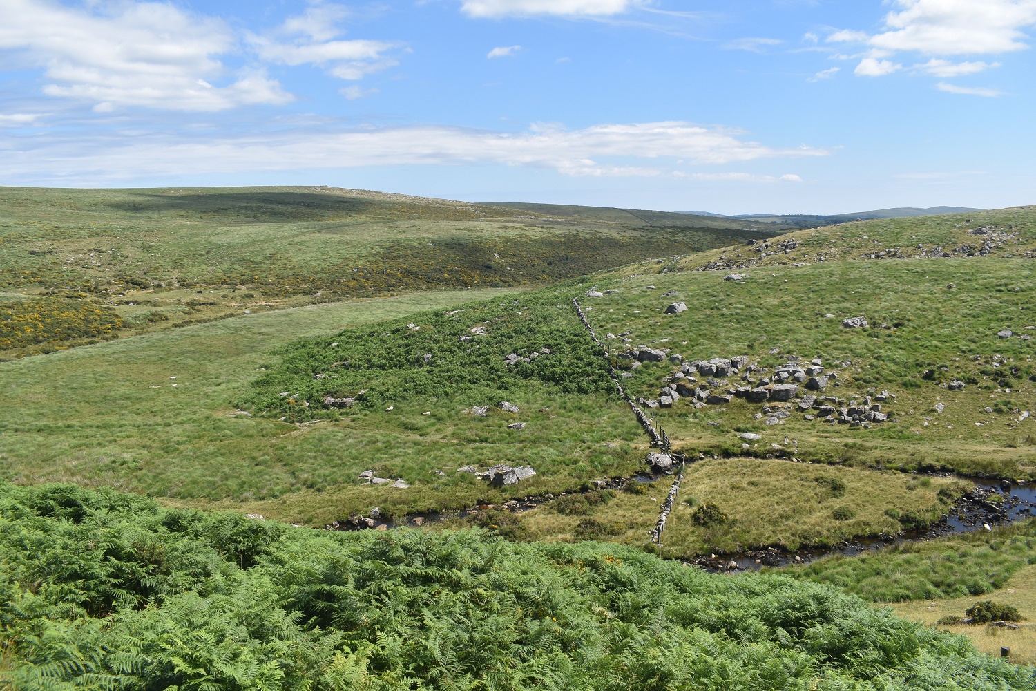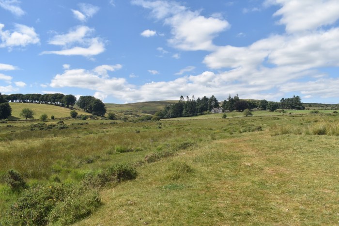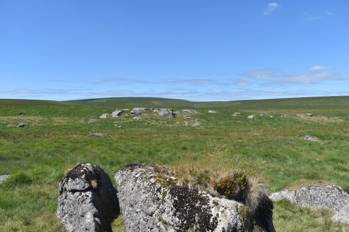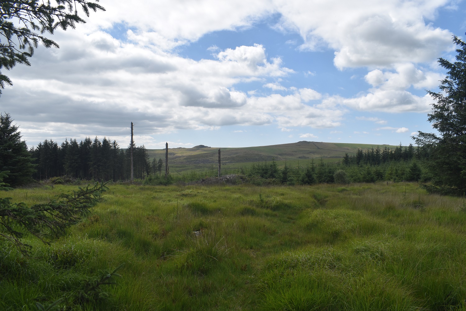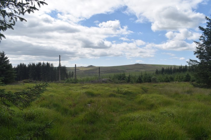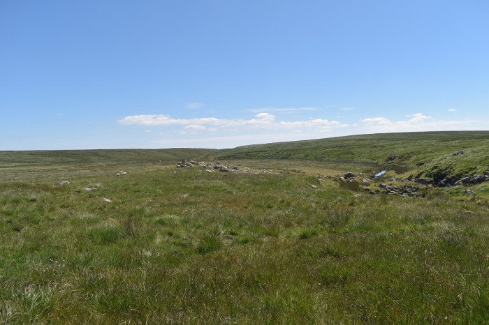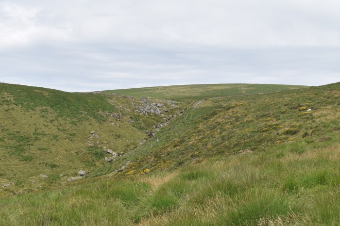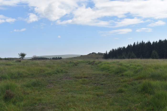 Behind Arch Tor, long grass, no paths, tough walking. Broadown Tor sticks up in the distance. However don’t head straight at it as that holds Archerton bog, heads slightly off left and down towards a wall