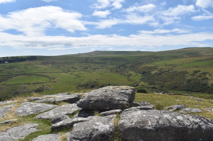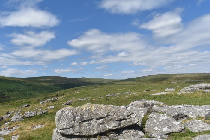 Its only a short walk to Broadown Tor, looking back down to Cherrybrook Rocks and the ridge which runs to Higher White Tor beyond