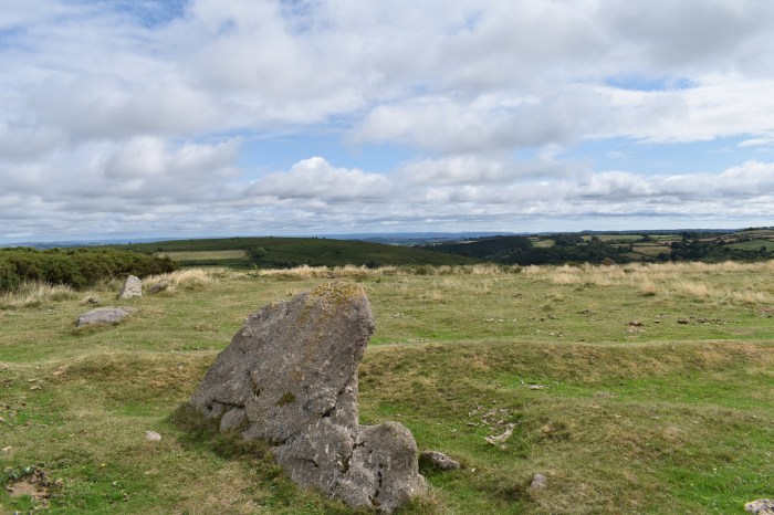 The top of Mardon Down is marked with this leaning stone. This is actually part of the Mardon Down Stone circle, the largest stone circle on Dartmoor