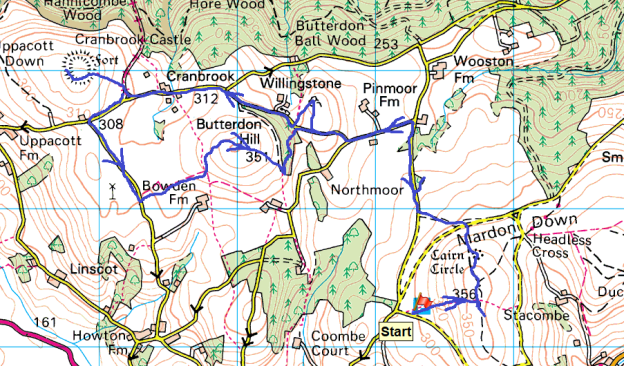 | Distance – 6.5 miles Start time – 11.45am Time taken – 3hrs 45mins Highest Point – Mardon Down 356metres |