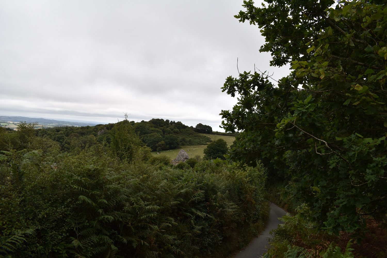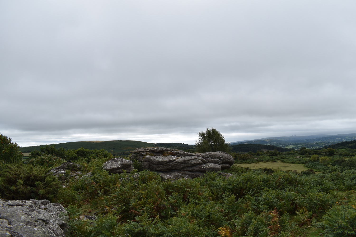 Somewhere slightly different today, still on Dartmoor, but right in the north eastern corner. This area is a fine place to walk if you don’t mind a bit of walking down lanes to get to places of interest or the odd hill and tor. I’ve parked here a couple of times now, firstly heading out southwards on a walk to take in Blackingstone, Heltor and Hingston Rocks as well as many other places. This walk heads north to Pin Tor and Uppacott Down via the lanes which have very few cars and are easy to walk along. That is, unless like me today, that the flies are out and follow you in the same way as a farm animal (about 18 inches behind your head. Bzzzzzzzzzzzzzzzzzzzzzz). The only respite was on the hills, were the breeze kept them at bay. It was a pretty warm and humid day, but no sunshine, but then again no rain either. The only other downside was the bracken on Butterdon Hill, it has made this hill pretty much impassable and certainly no fun at all. The bracken was shoulder height most of the way and I disturbed at least one deer who was hiding in there. All the paths to the summit were submerged in the green blanket, horrible. Come back in a month or so when it has died away. Still the actual route is a good one and I will do this again, possibly adding on Fingle Bridge as well.