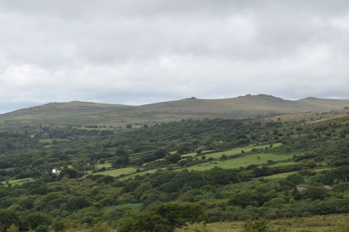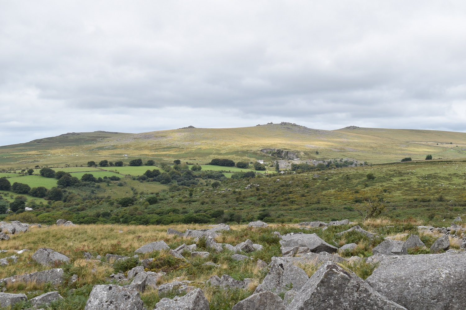 Cox Tor left, then the Staple Tors and Roos Tor back right across some green farmland around Merrivale