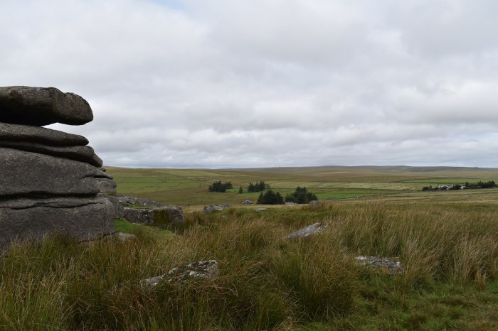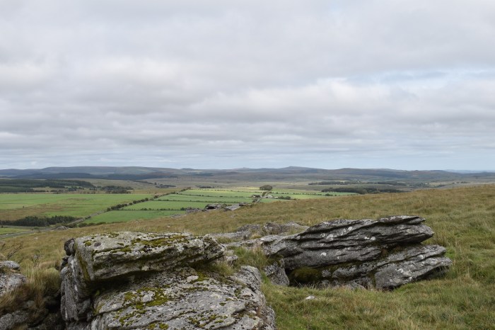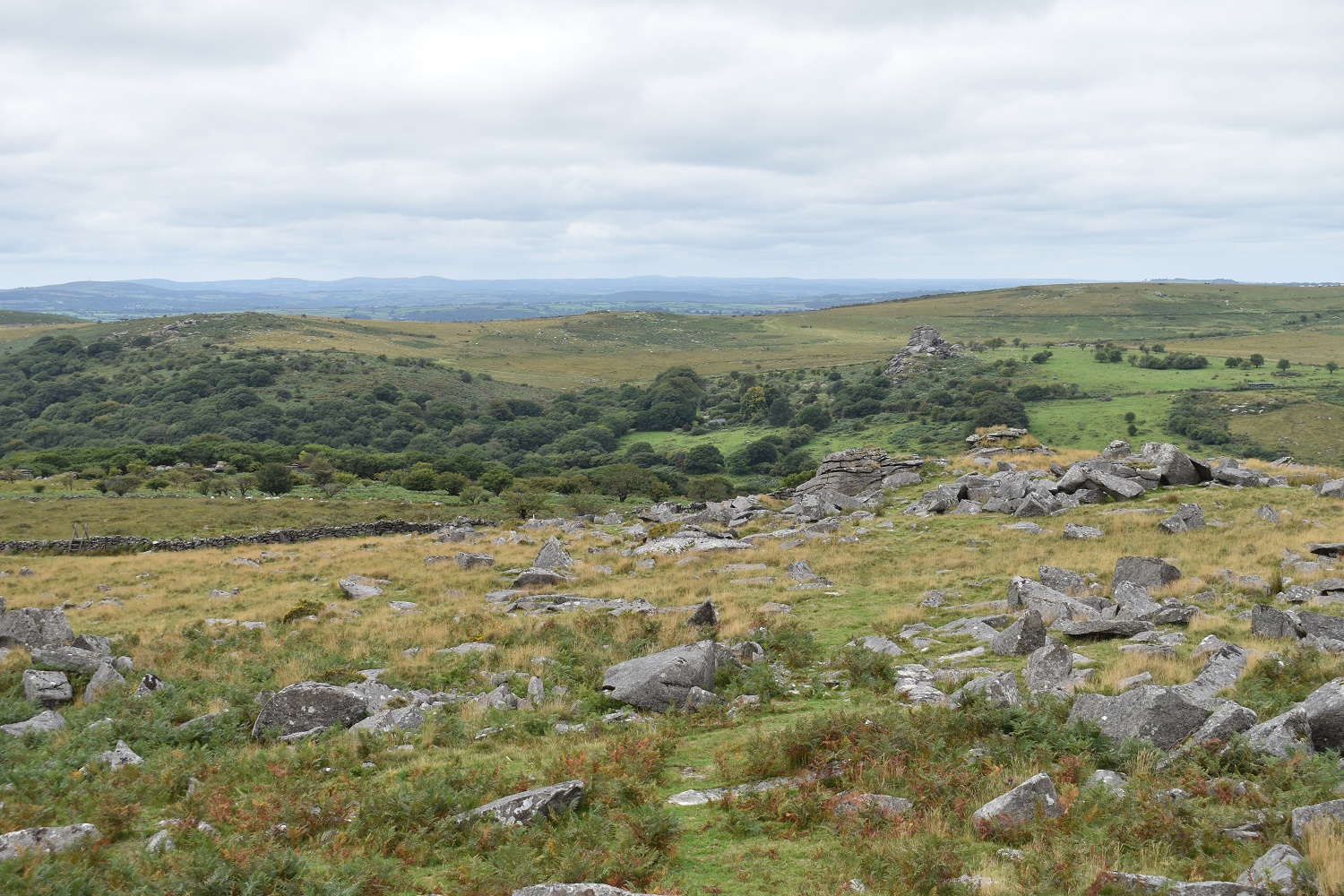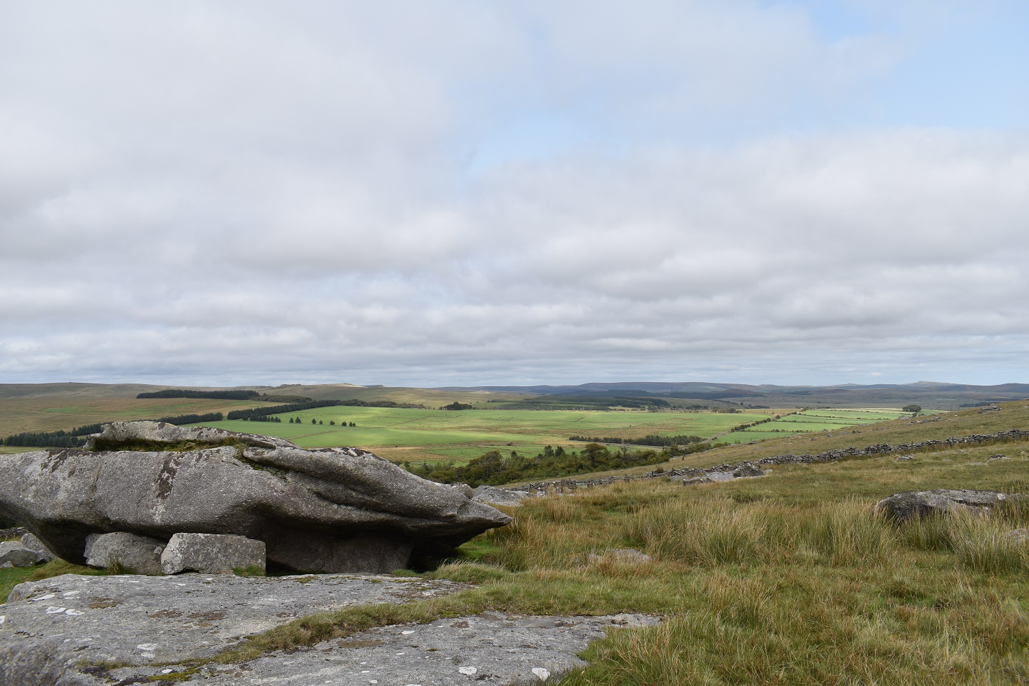 The same green fields this time from Herne Hole Tor, which is the other side of a wall from Rundlestone Tor. The flat topped tor in the far distance is Hameldown