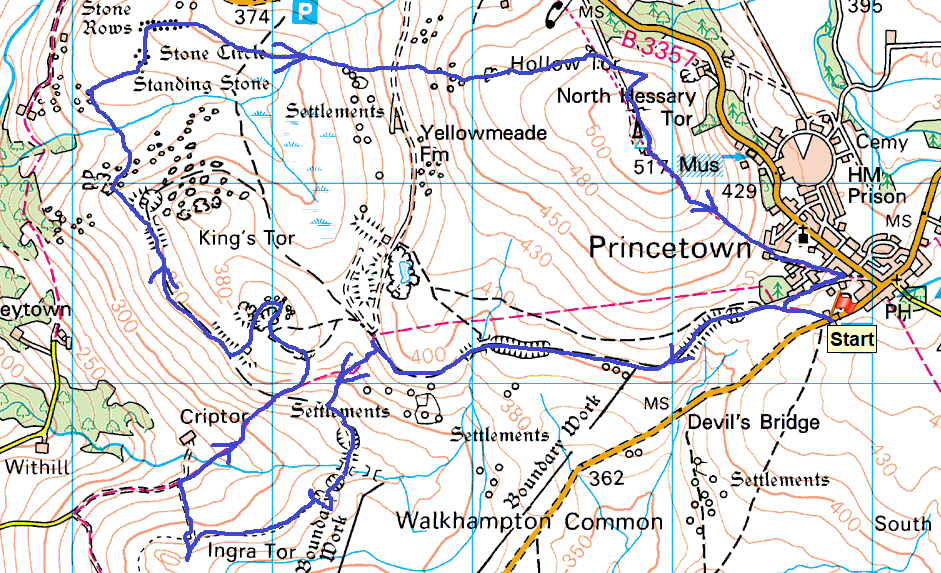 | Route – Plymouth/Princetown railway – Yes Tor (Walkhampton) – Fur Tor – Ingra Tor – Criptor – Swell Tor – Plymouth/Princetown railway – Longash – Merrivale Stone row and circle – Hollow Tor – Rundlestone Tor – Herne Hole Tor – North Hessary Tor – Princetown mast – Dartmoor Brewery – Princetown parking |
