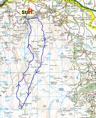 | Route – Belstone Cleave bridge – Belstone Cleave – Ivy Tor – Cosdon Hill – Little Hound Tor – Whit Moor Stone Circle – Hound Tor – Wild Tor – Hangingstone Hill – Steeperton Tor – Metheral Hill – Taw Marsh – Ottery Tor – Belstone Cleave bridge – Belstone |