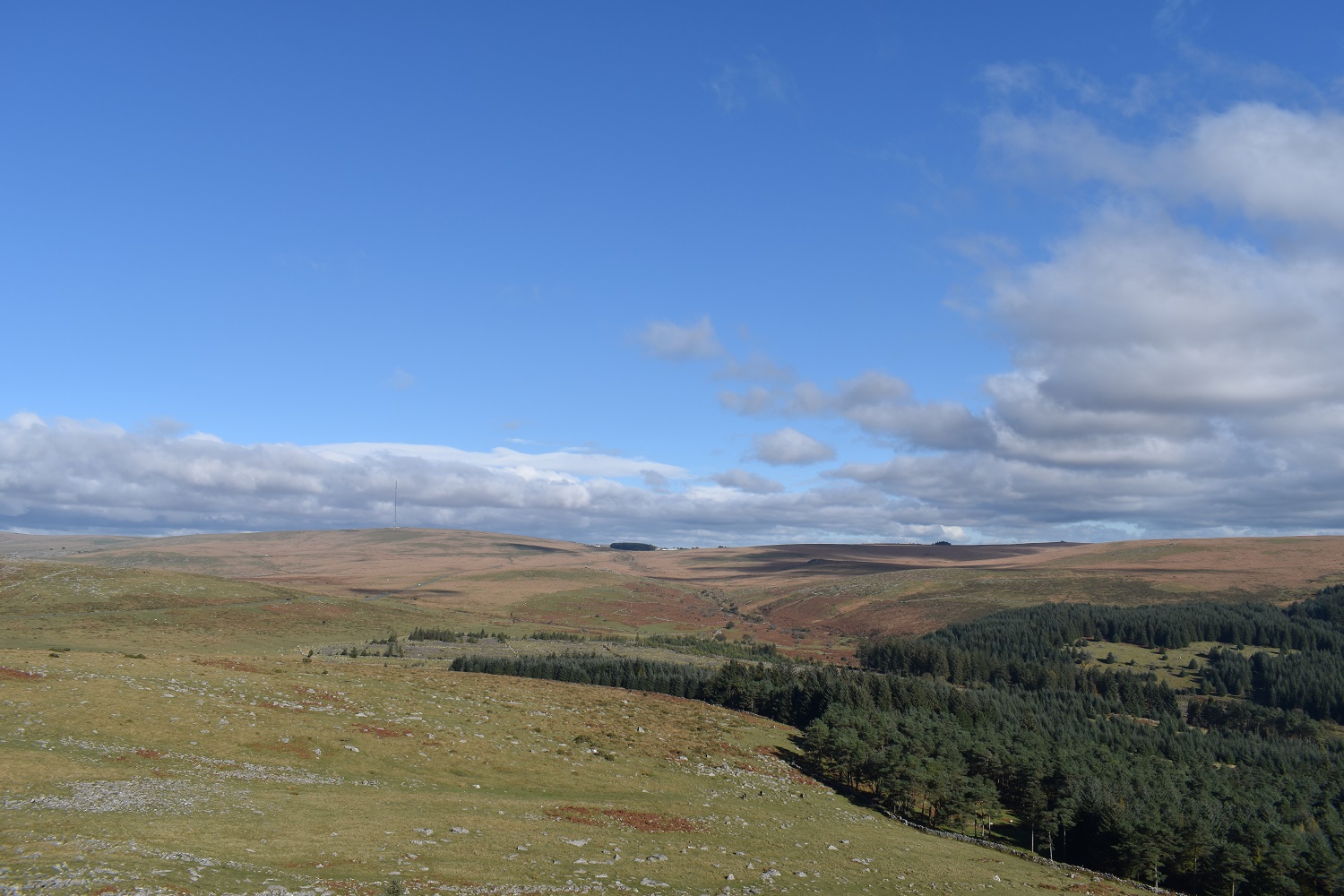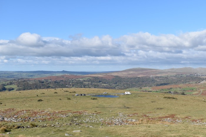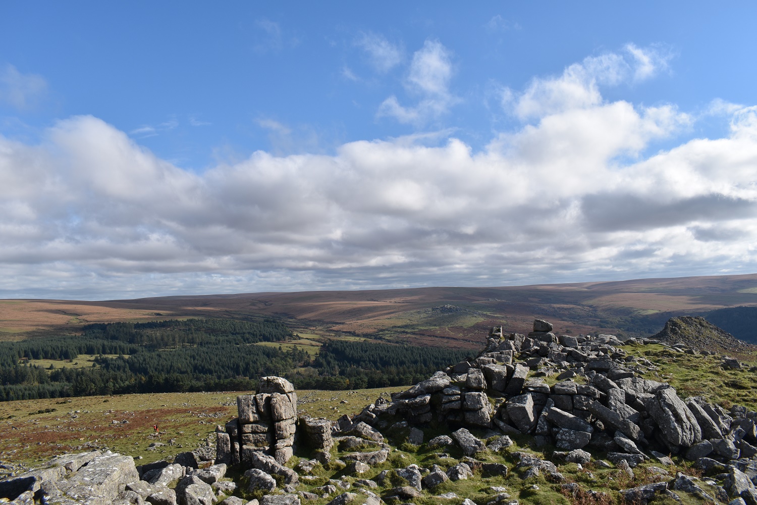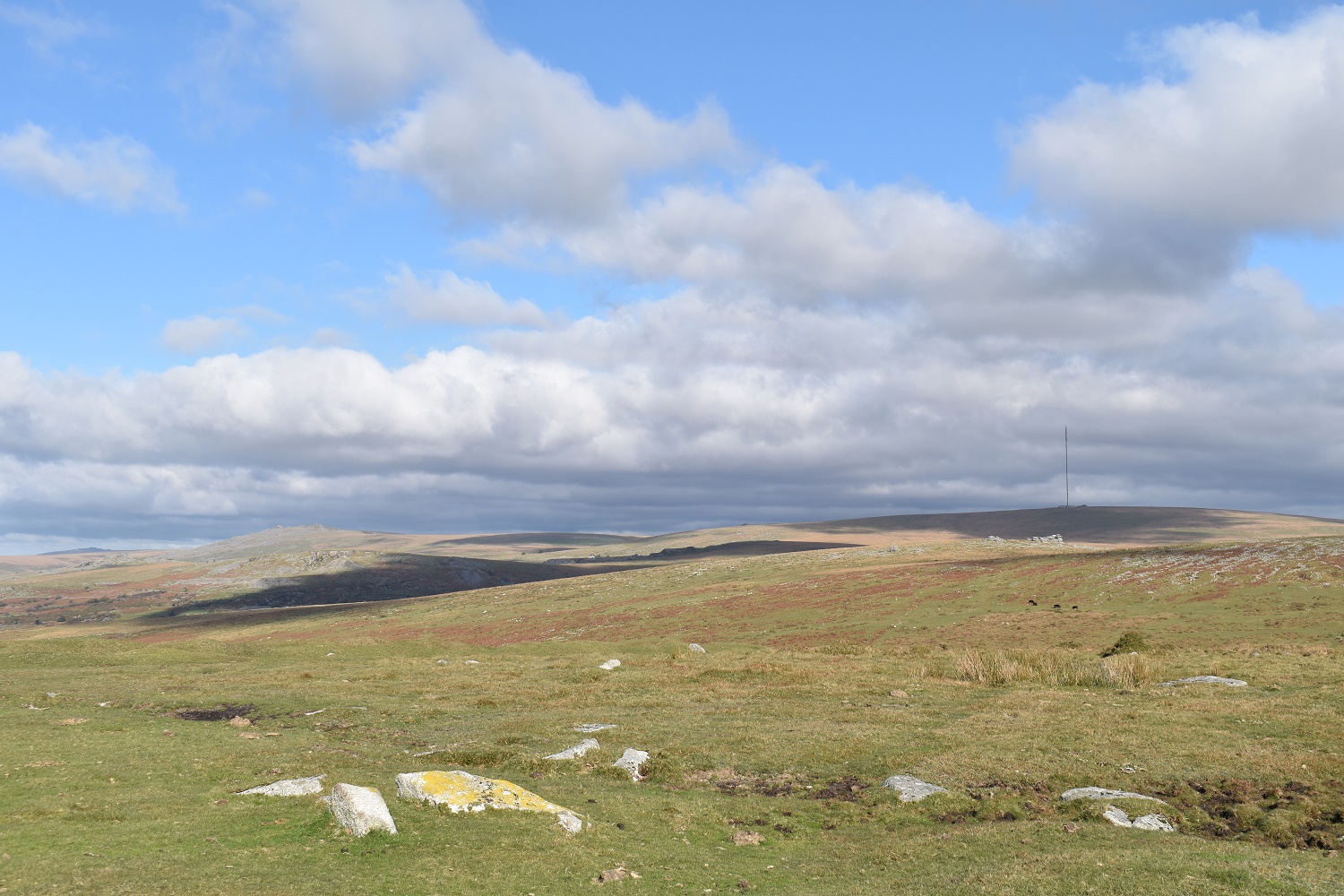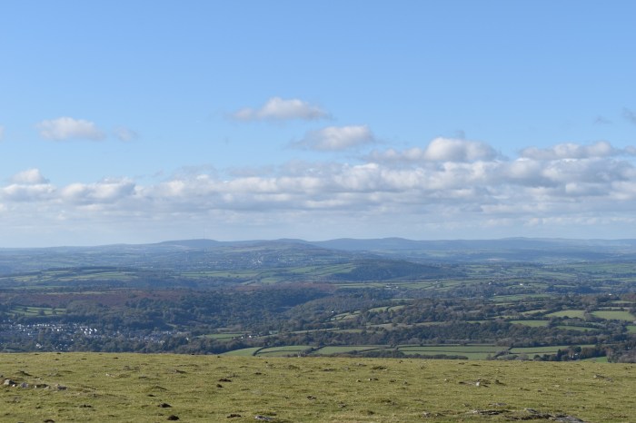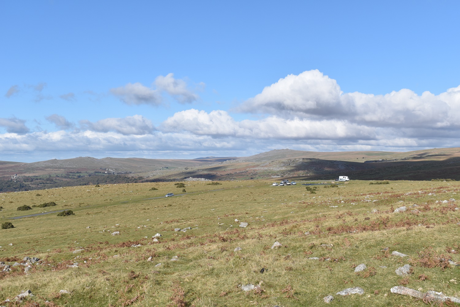 Looking back down to the car park and beyond to Cox Tor and Brent Tor in the distance looking very dark