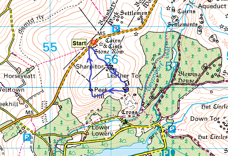 | Route – Sharpitor – Leather Tor – Lowery Tor – Peek Hill – Sharpitor parking |