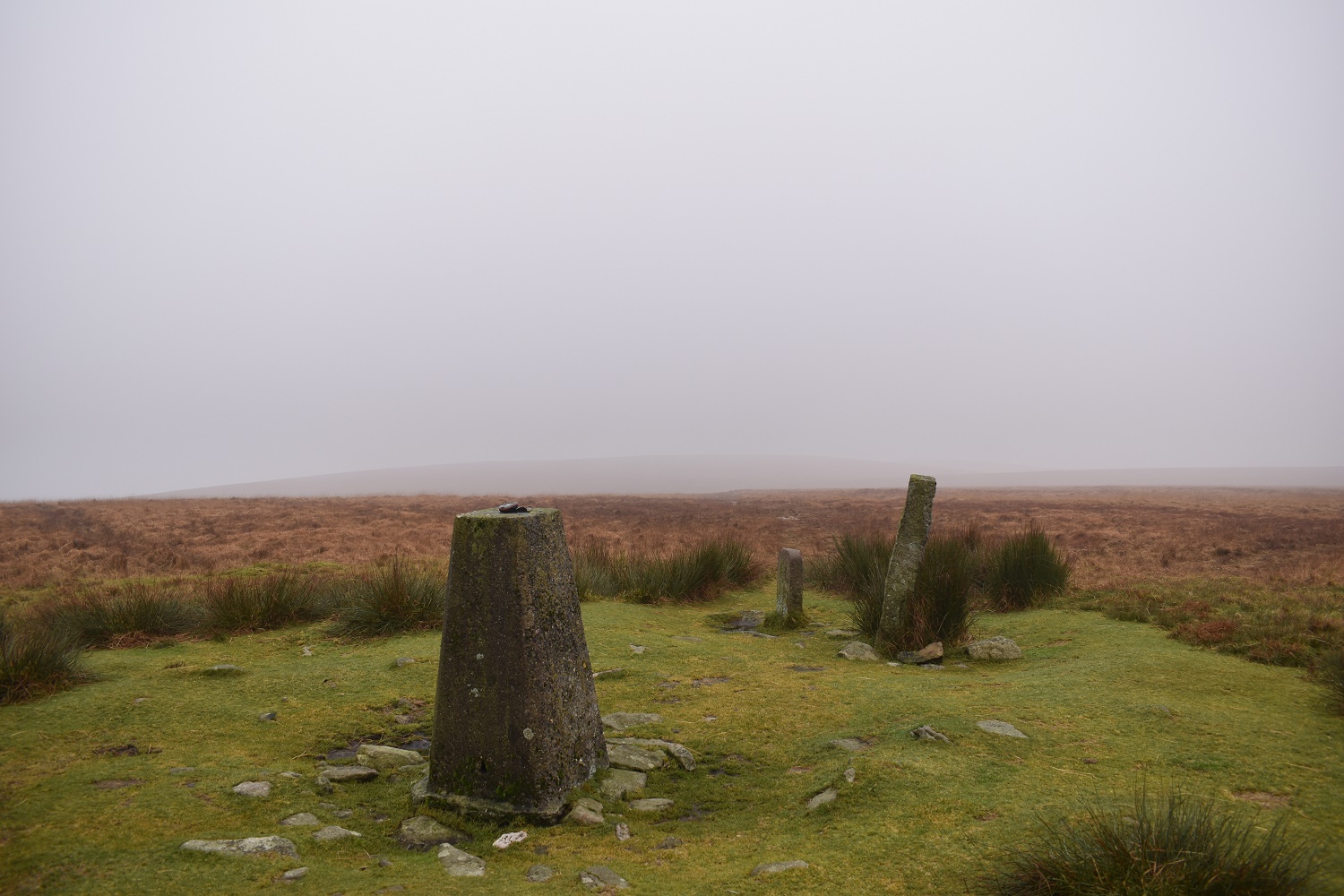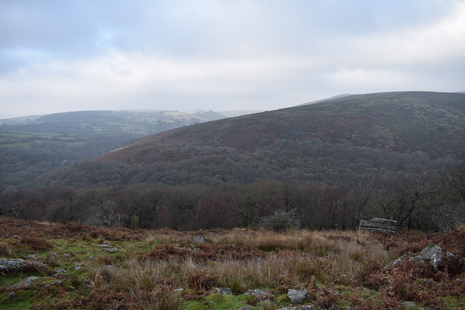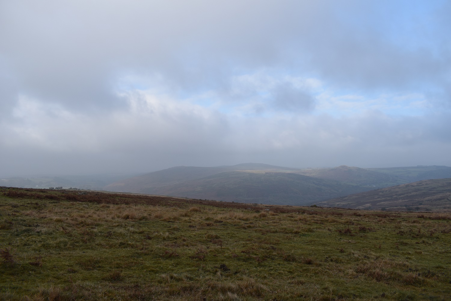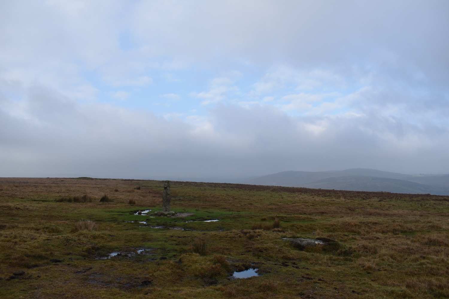 Horn’s Cross with Corndon Tor in the distance, the weather here was strange, blue sky was over the Corndon Tor area, and patches of sun moved across the hills