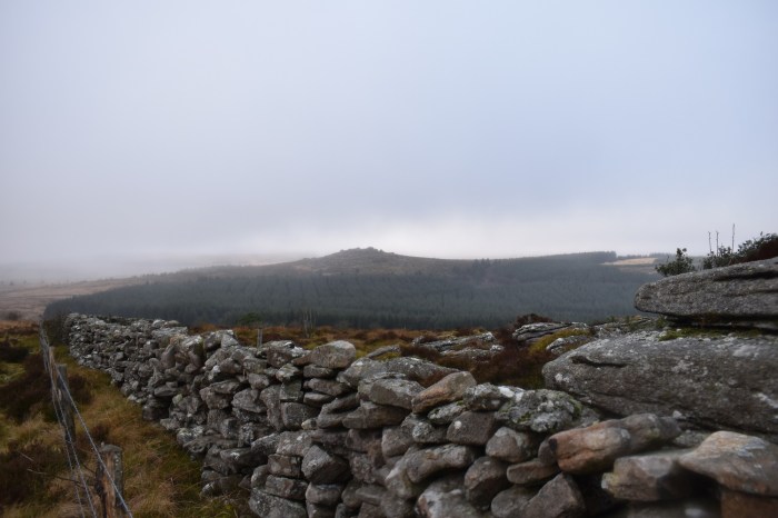 More low cloud and drizzle on the way as I leave Bellever Tor. Princetown and the mast should be in view looking this way, but not today