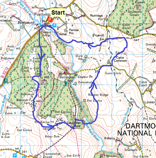 | Route – Postbridge Clapper Bridge – Lakehead Hill – Bellever Tor – Laughter Tor – Laughter Hole Farm – Laughter Hole Stepping Stones – Riddon Ridge – Cator Bridge – Cator – Pizwell Farm – Postbridge parking |
