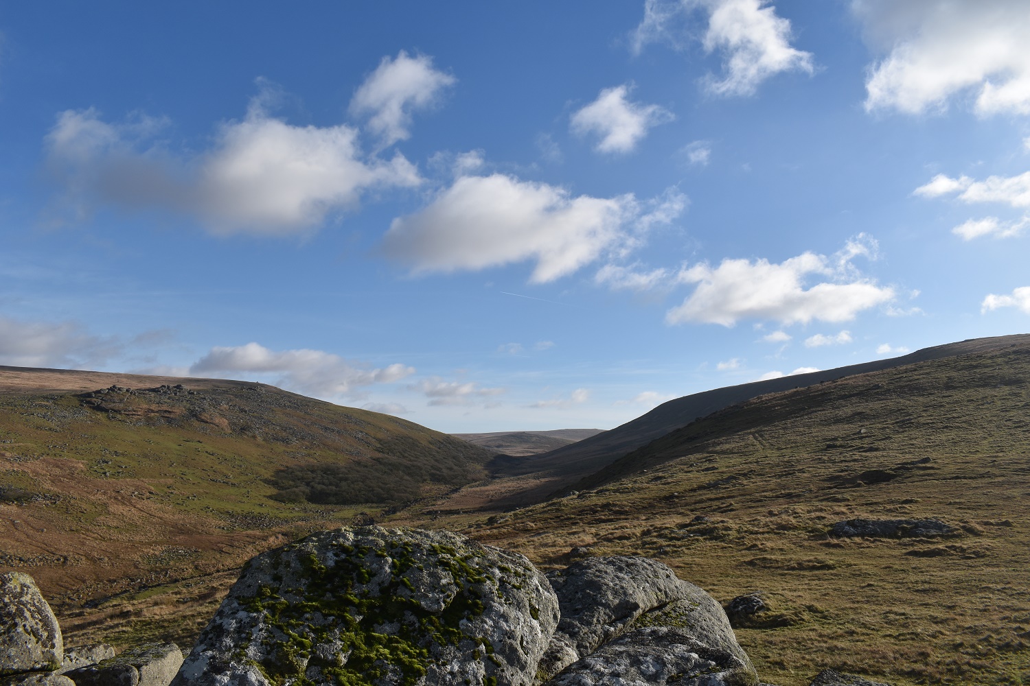 And a glorious view up the West Okement valley from here. Lints Tor at the far end, Black Tor left and the Slipper Stones right. Black-a-tor copse at the base of the valley