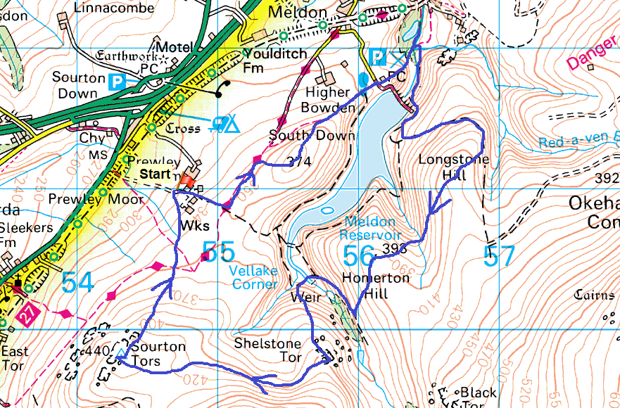 | Route – South Down – Meldon Reservoir – Meldon Pool – Meldon Pool Bridge – Longstone Hill – Homerton Hill – Vellake Corner and weir – Shelstone Tor – Sourton Tor – Ice Factory – Sourton parking |