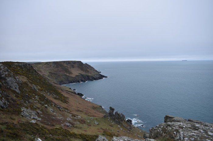 Off Cove again as I reach the start of the walk, Bolt Head across the cove and a ship the size of Belgium sailing across the channel