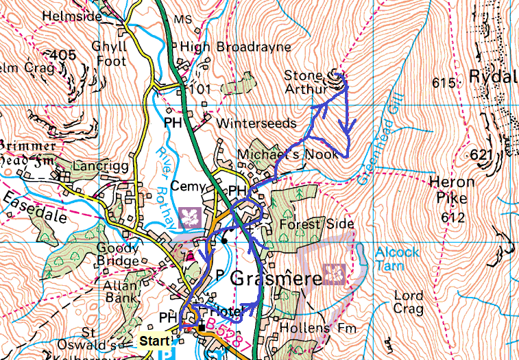 | Route – A591 – Our Lady of the Wayside church – Michael’s Nook – Stone Arthur – Greenhead Gill – The Swan – Grasmere Gingerbread Shop |