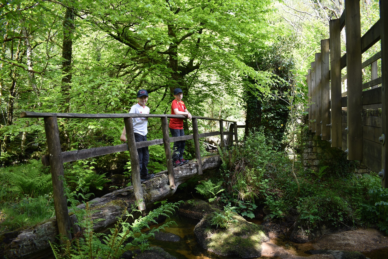 Horsham Steps, the boys give an idea of the size of some of the boulders here. The River Bovey is under the rocks.
