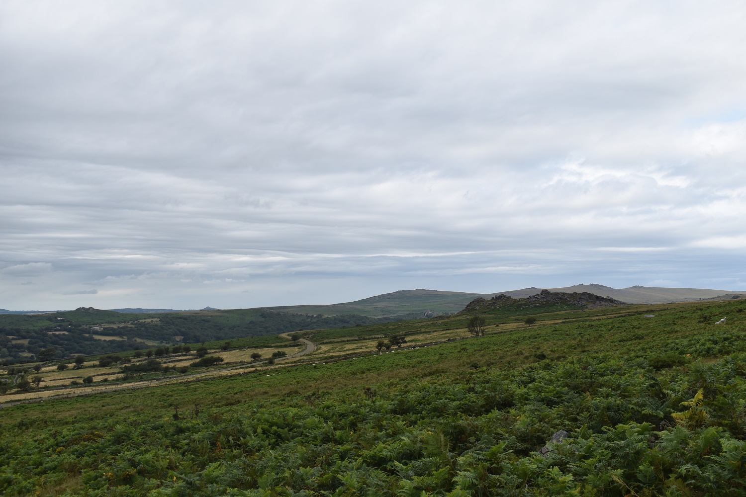 Climbing through the bracken with Ingra Tor being the nearest tor. Cox Tor and the Staple Tors behind