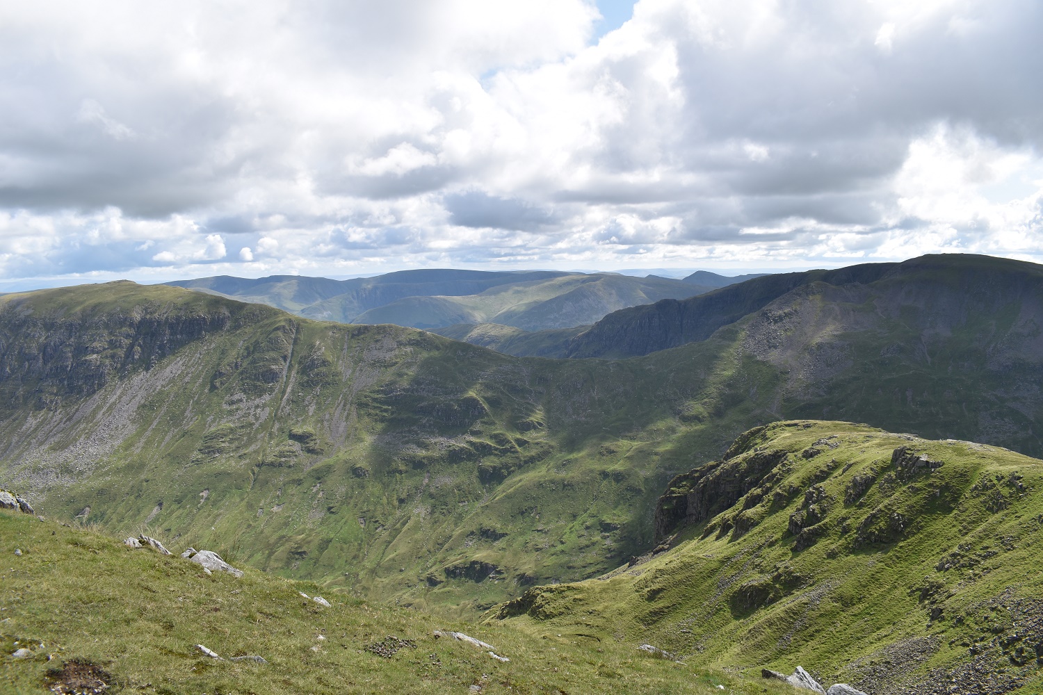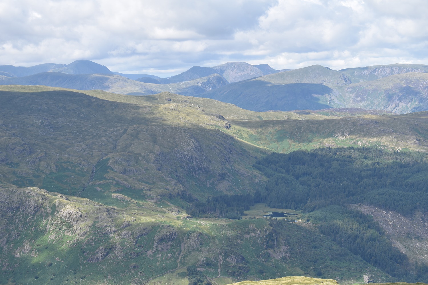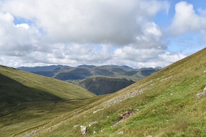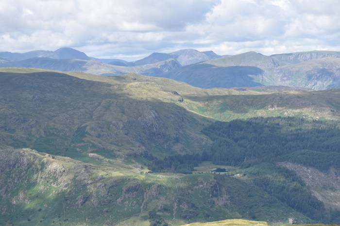 Looking back down the Raise Beck route and valley. Steel Fell now backed by layers of fells all the the way to Scafell Pike and Bowfell