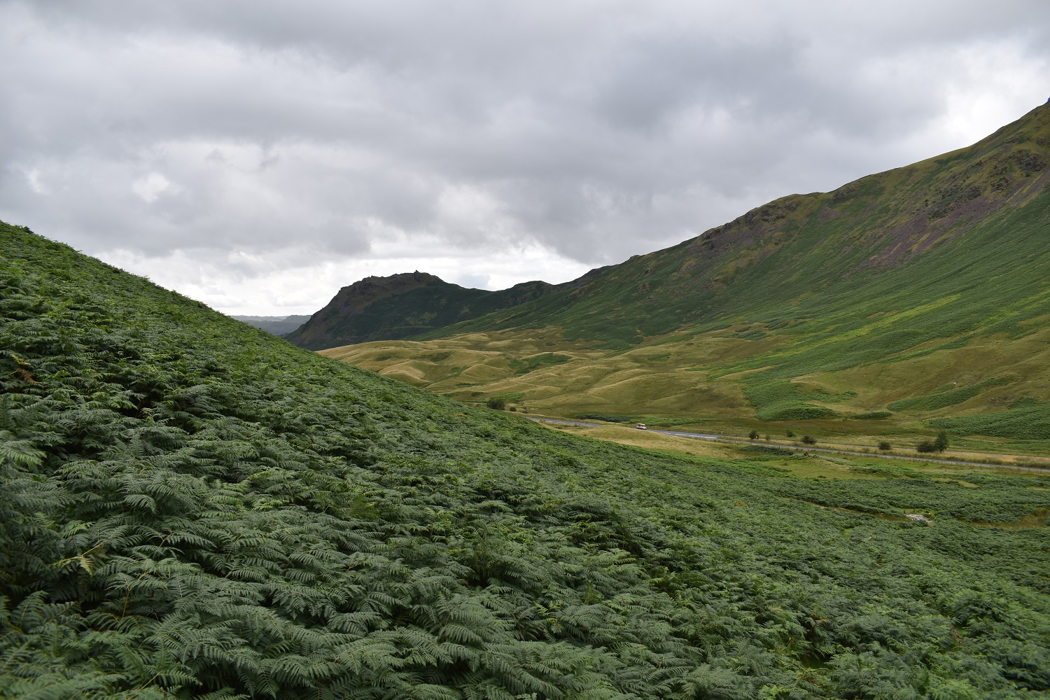 There is a short section through bracken first, but before long we were in the Raise Beck gill and the bracken disappeared. The dark fell over there is Helm Crag with the A591 below