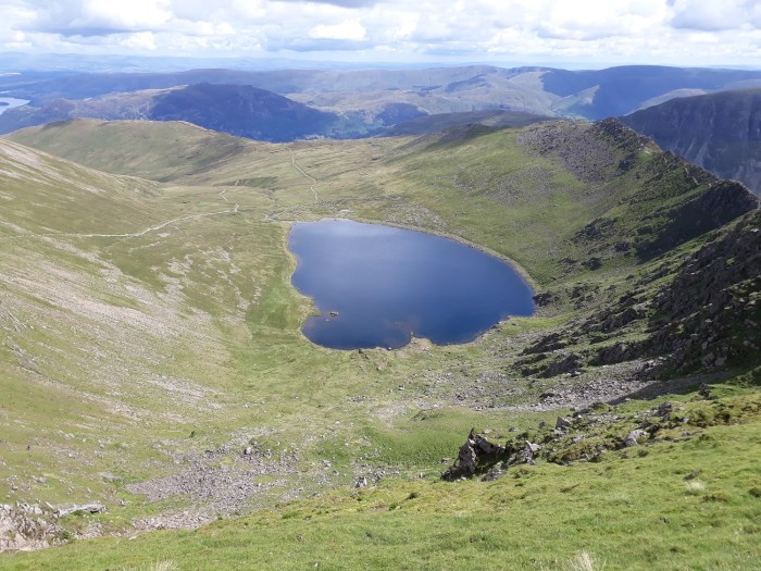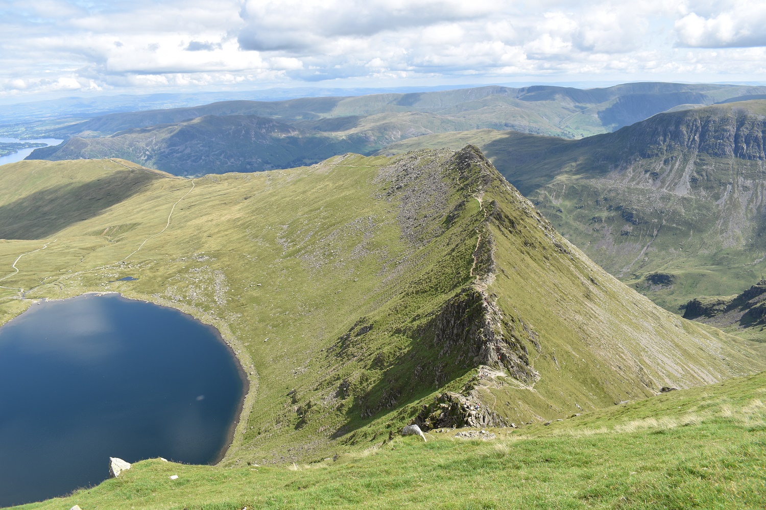 Swirral Edge is a tough decent of this mountain. Keppel Cove and the broken dam is down on the left. Catstycam extends beyond Swirral Edge