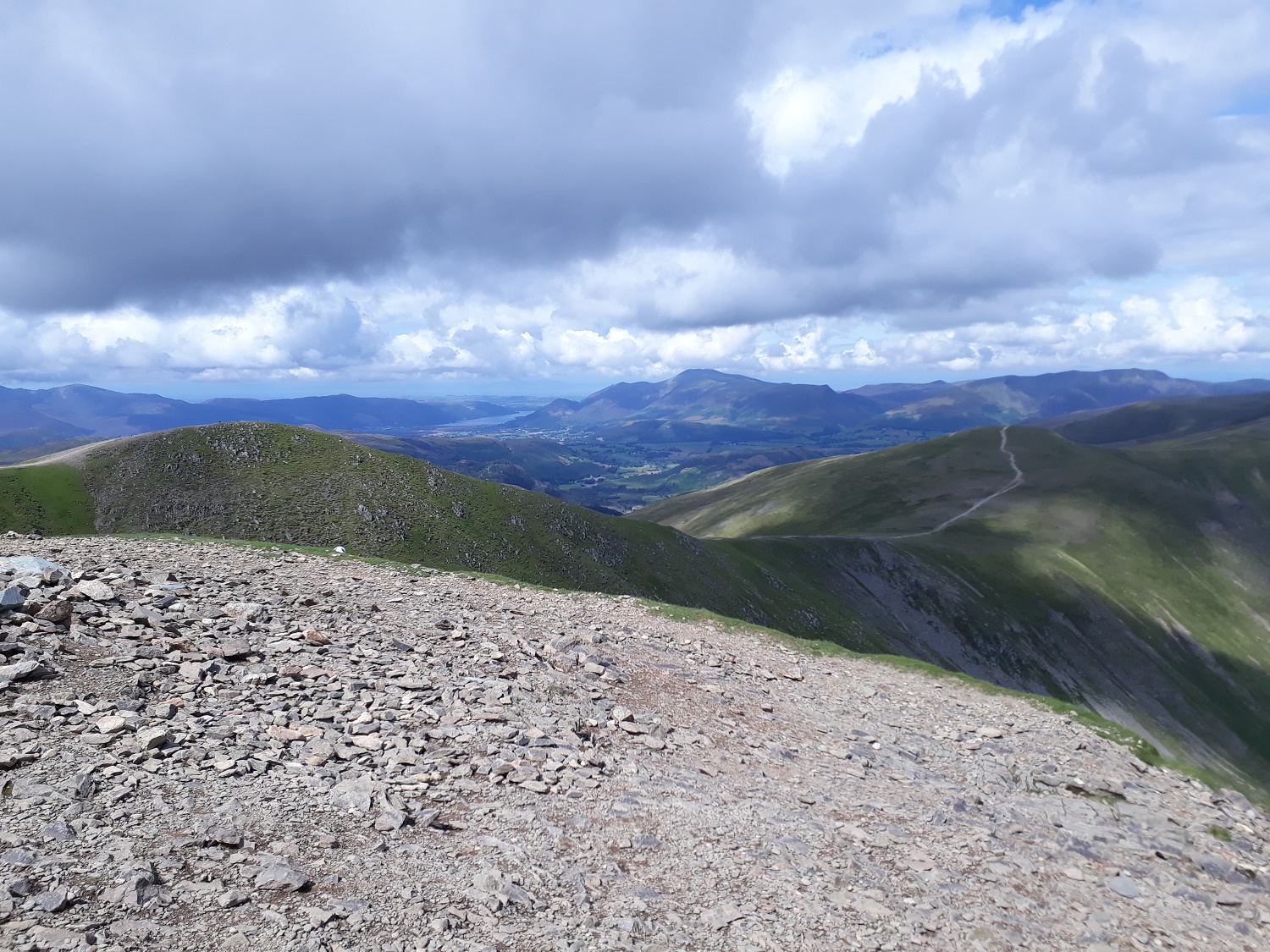 Helvellyn Lower Man on the left and the path leading to Whiteside. Skiddaw is in and out of the clouds in the distance