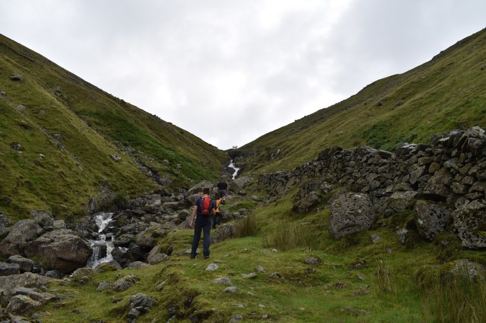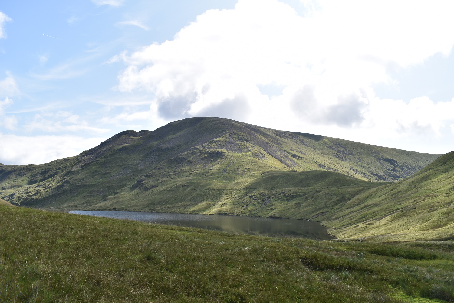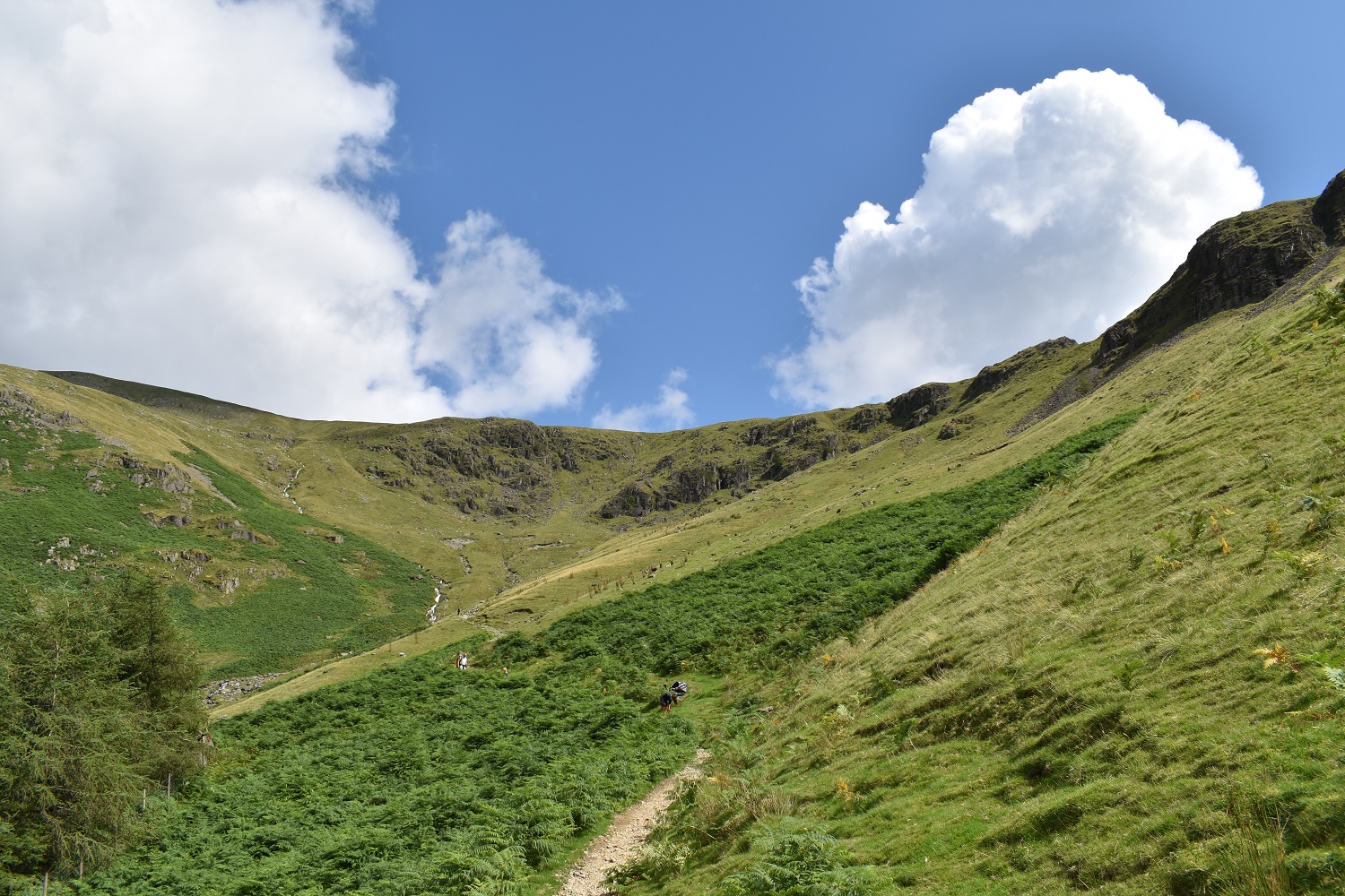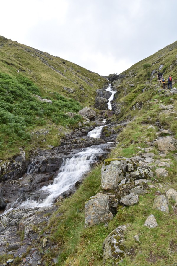 After a rest at the tarn we started up the zigzag path to Dollywaggon, Seat Sandal in view to the right of the tarn. Great Rigg is in the sun opposite