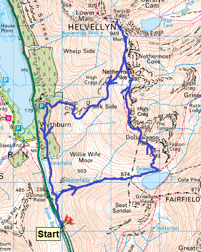 | Route – Raise Beck – Grisedale Tarn – Dollywaggon Pike – High Crag – Nethermost Pike – Helvellyn – High Crags – Birk side – Wythburn path – Raise Beck – A591 |