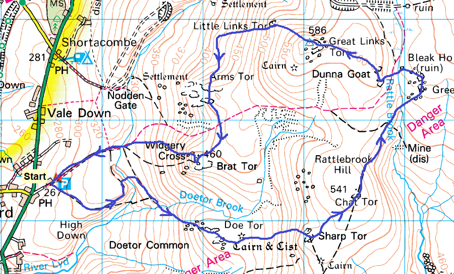 | Route – Black Rock – River Lyd – Doe Tor Brook Bridge – Doe Tor – Sharp Tor (Lydford) – Chat Tor – Rattlebrook – Green Tor — Bleak House – Lower Dunna Goat – Higher Dunna Goat – Great Links Tor – Little Links Tor – Smallacombe Rock – Arms Tor – Brat Tor – Lyd Bridge and Stepping Stones – Lydford parking |