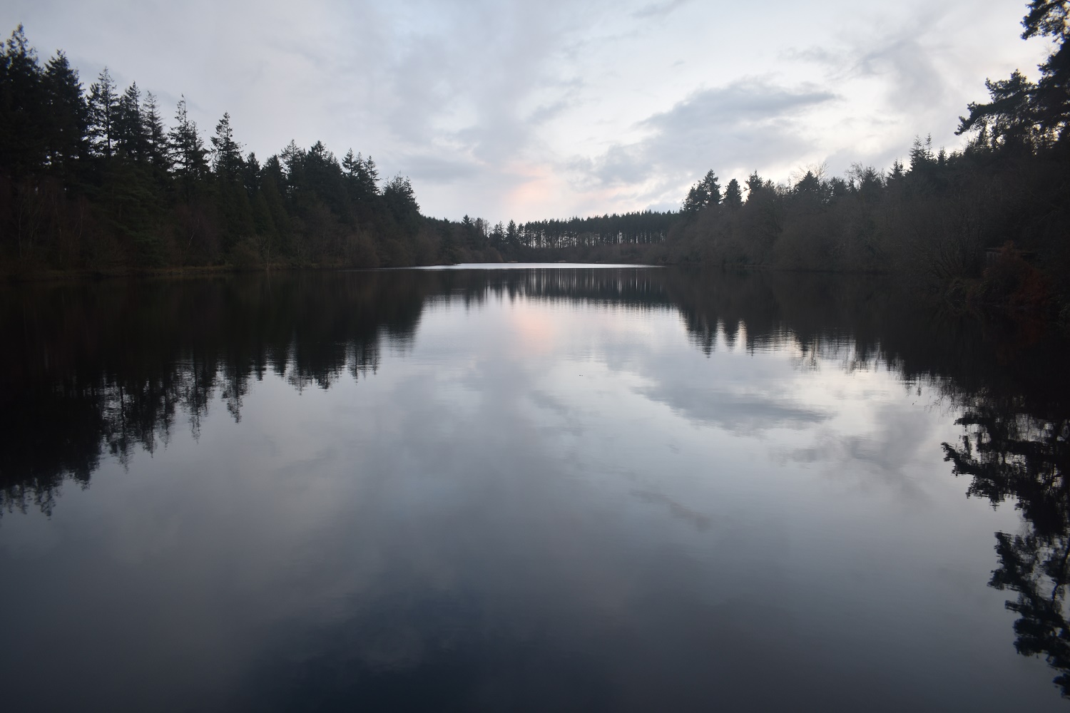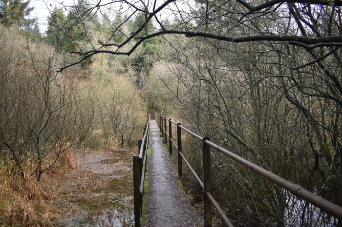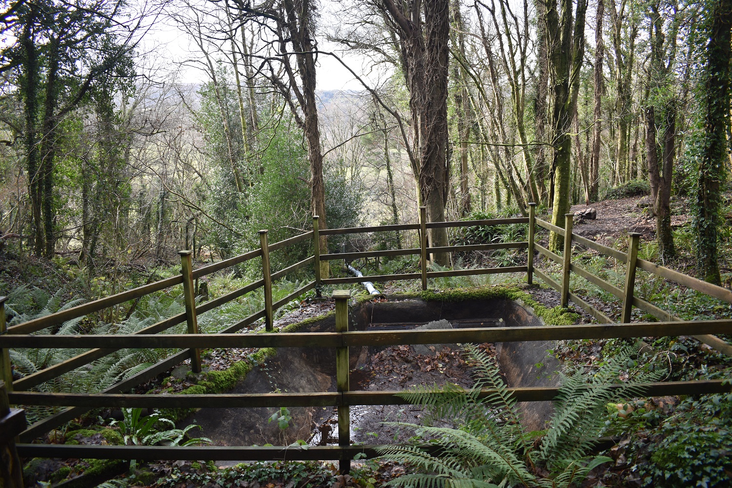 The Kelly Mine reservoir, you can see the pipe between the wooden posts beyond. The main path up through these woods is just to my left