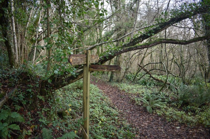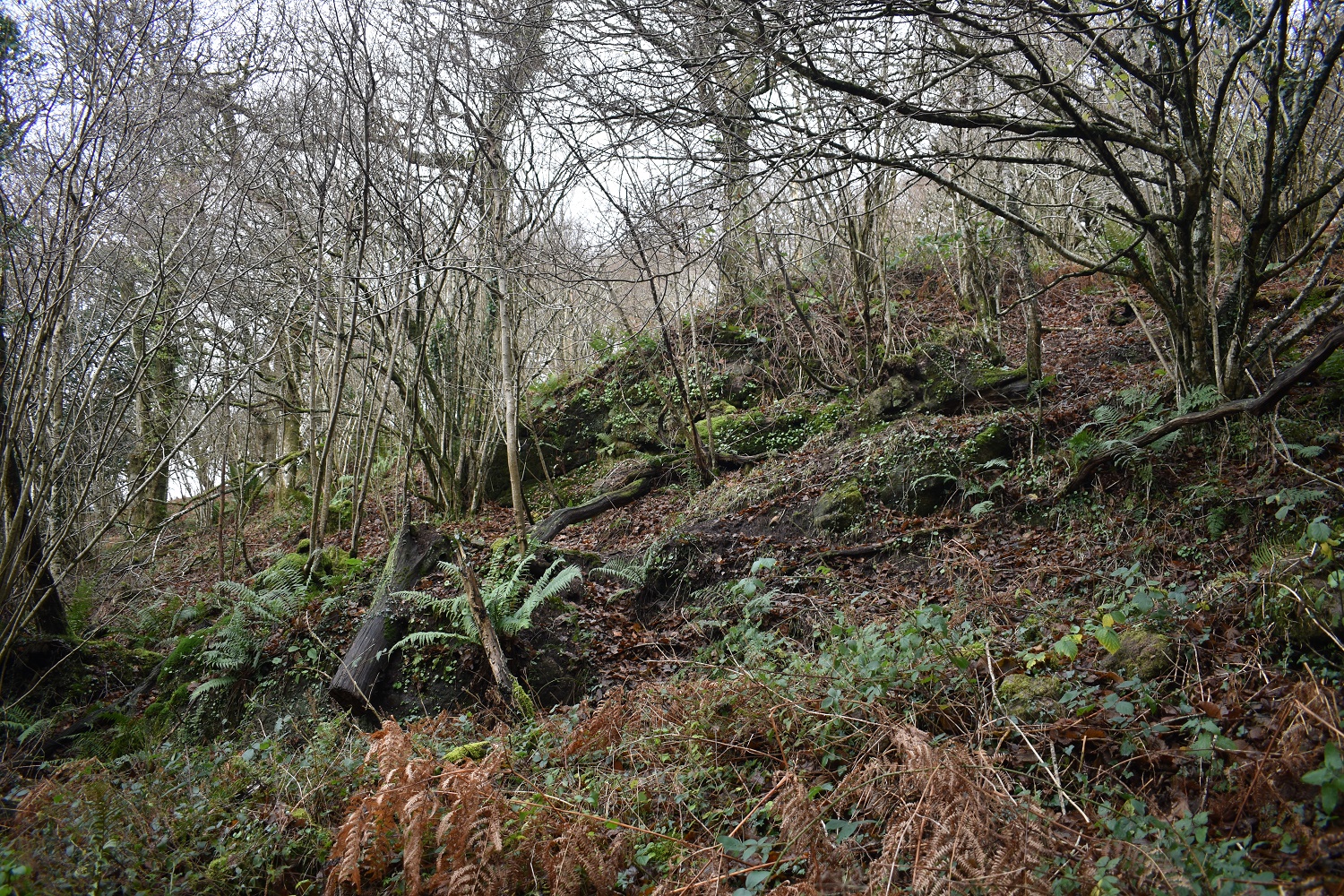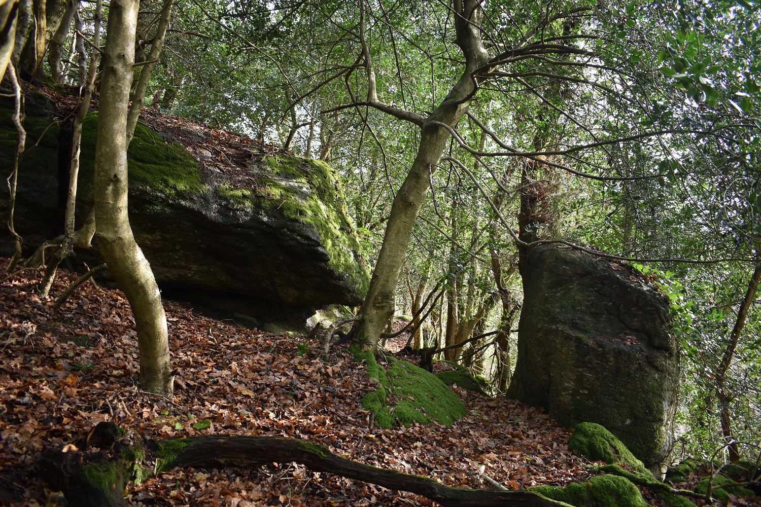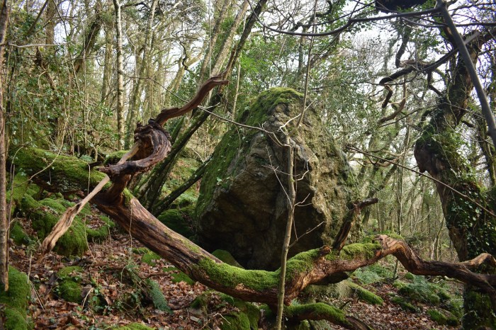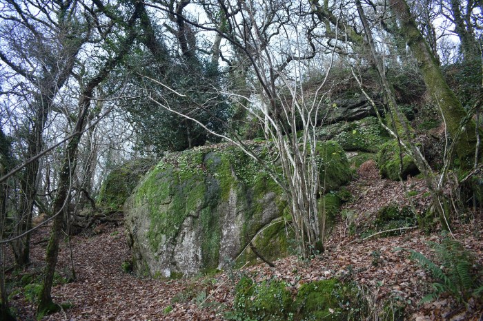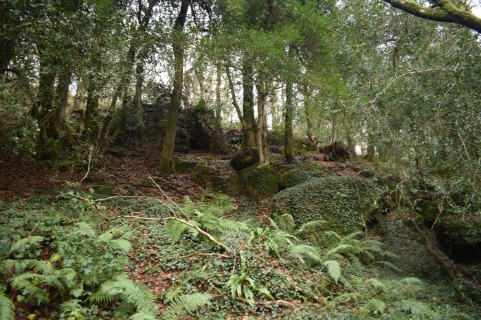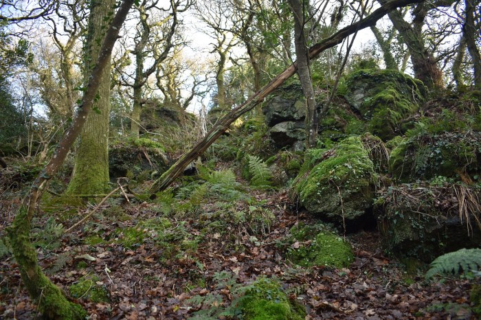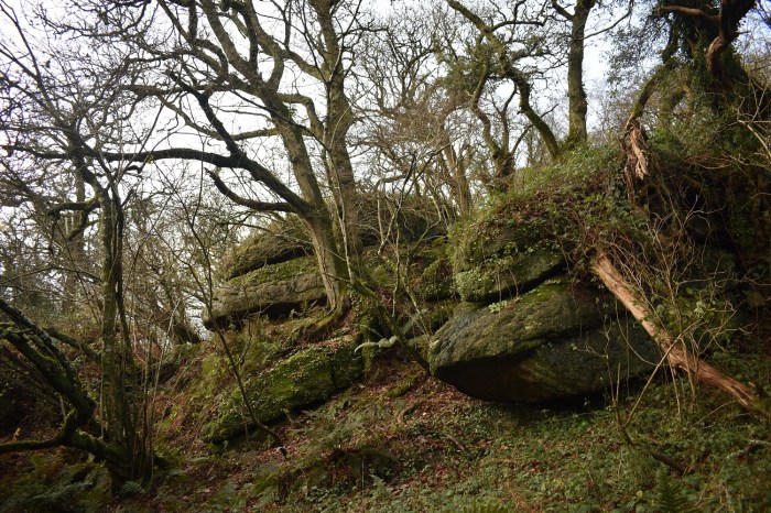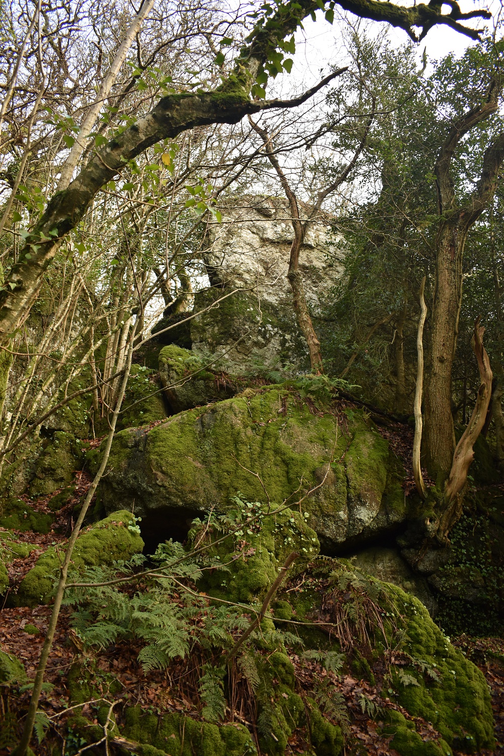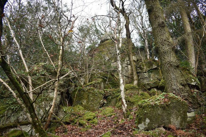The rocks tumble down hill here. Next is a return back the way you came to the path through Shaptor Woods