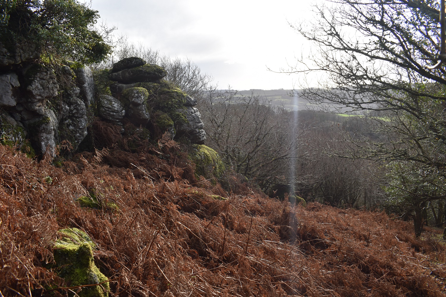 Following the track below Long Cleave Tor out of the trees to a small opening area, I followed the track opposite up a slight incline to a stile and the entrance into Shaptor Woods. Immediately after entering I went 90 degrees left and upwards for a couple of hundred metres to the outcrops here of West Shaptor. This one also has a vantage point