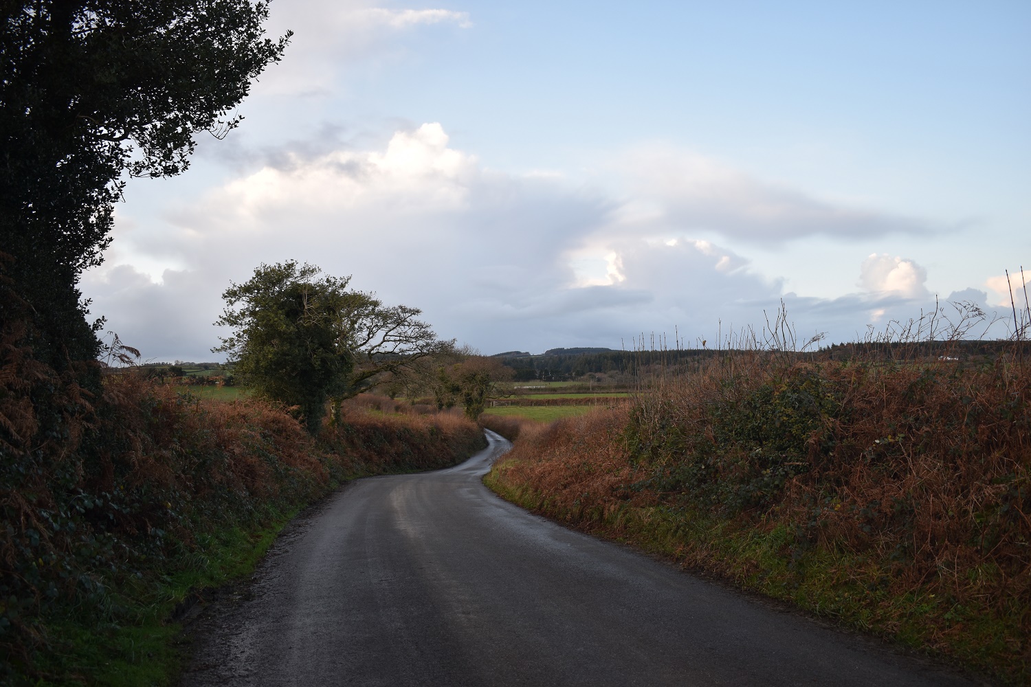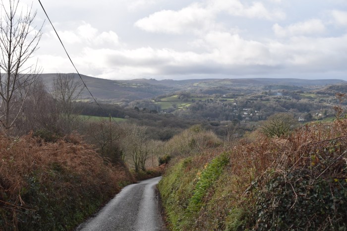 I headed the way the fence had fallen and carried on in that direction as I wanted to get to Bell Lane. By heading around a new build property/barn but still in the woods I dropped out of Castor Woods onto the lane on an S bend. All that was needed was a 100 metre upward walk. Here I look back down Bell Lane towards Hound Tor and Black Hill