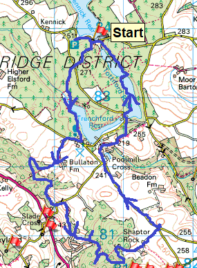 | Route – Slade Rocks – Trenchford Tor – Bullaton Farm – Bullaton Rock – Kelly Mine Tor – Little Castor – Higher Castor – Lower Castor – Gladstone Rock – Hawkmoor Rocks – Long Cleave Tor – West Shaptor – Northcombe Copse Tor – Lower Shaptor – Sonny Copse Tor – Shaptor Rocks – Poolmill Cross – Tottiford Reservoir – Kennick Reservoir |