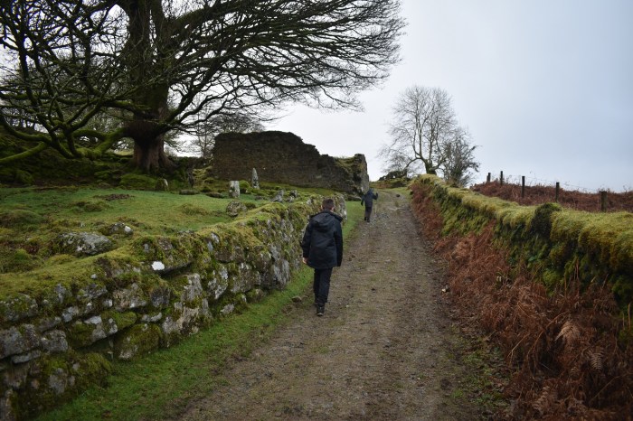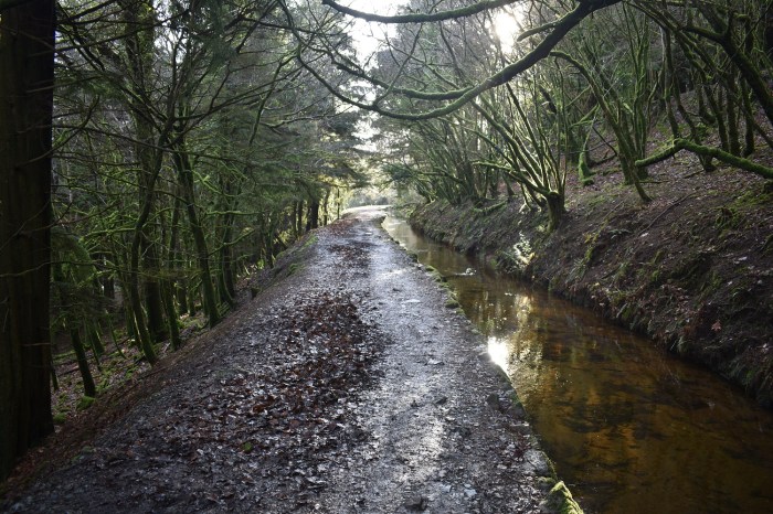 The part where the Devonport leat is stopped and drops into Burrator, originally this leat would carry on to Devonport. We are taking the leat path, rather than the wider track to the left of this building