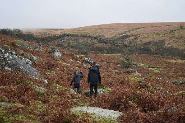 Heading to Deancombe Rocks, straight ahead on the hillside above the boys