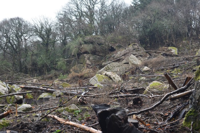 The tors on Wood Hill would normally be in a wood of fir trees. However these have been removed, opening the views across to Mardon Down. The native trees are still around the edge of this section and in fact they dominate this hillside still.