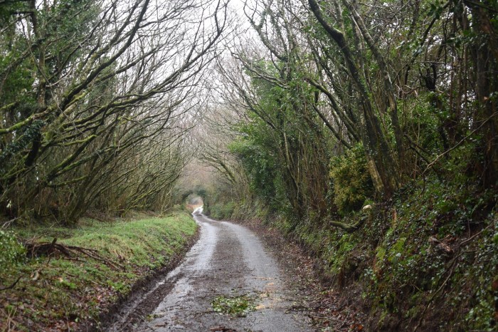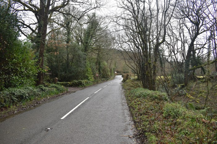 Through the hamlet and then rather than follow the B3212 to the junction ahead here, I came along a steep uphill tree tunnel path to this point.