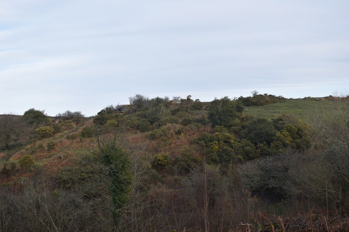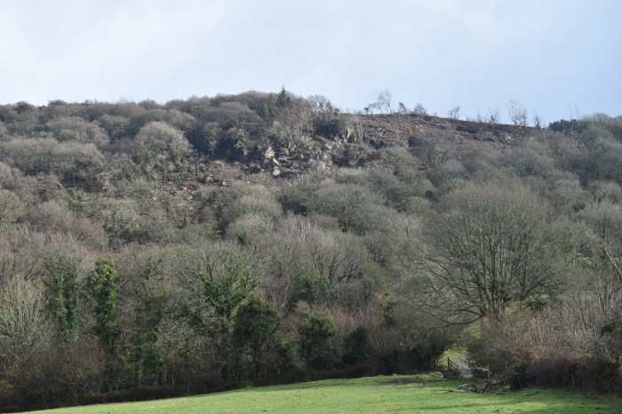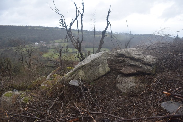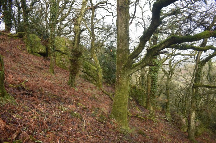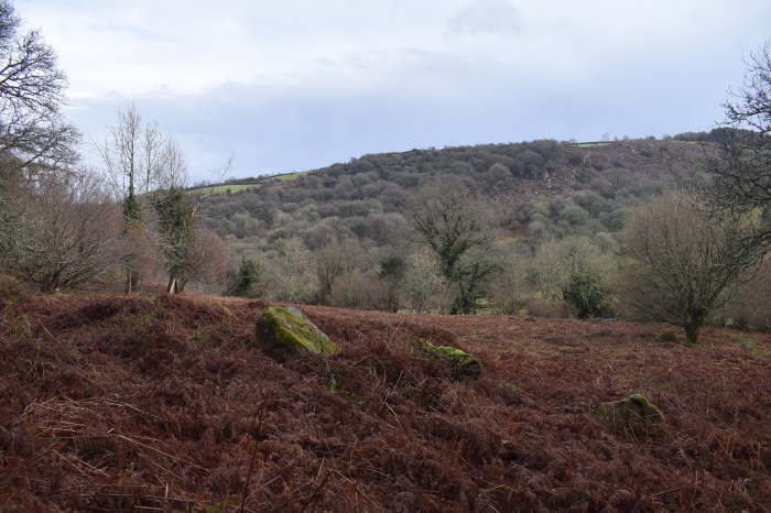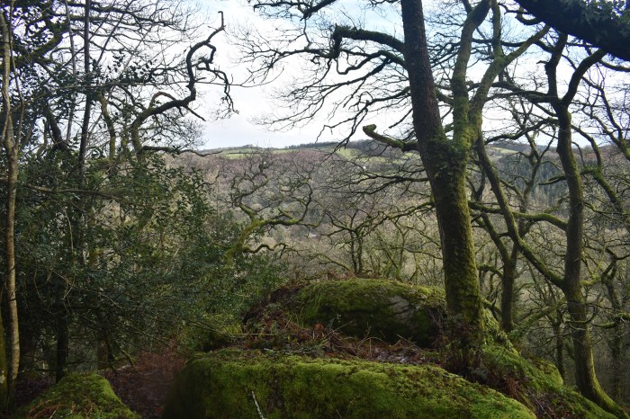 Climbing up into Woodcock Wood and looking back across to the Wood Hill tors