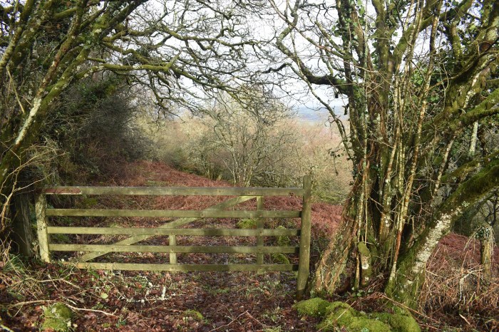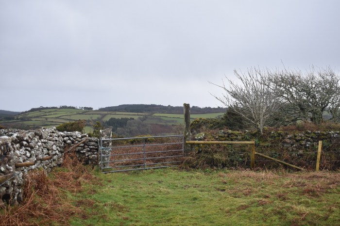 The path following the wall eventually leads to this broken gate. To my right is Leigh Valley Tor and ahead is the faint path which takes you back to the tarmac track above Leign Farm