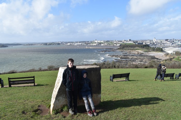 Posts and signs everywhere here for the south west coastal path. Plymouth Hoe and Mountbatten behind the boys