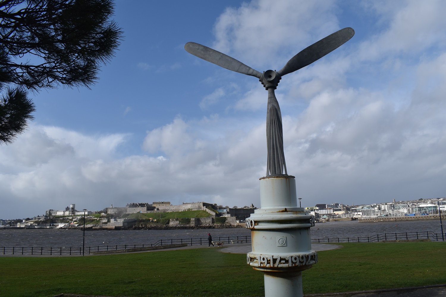 The citadel sits high on Plymouth Hoe behind the propeller replica from a Sunderland flying boat (1929). A link to the heritage of the flying boats from RAF Mountbatten