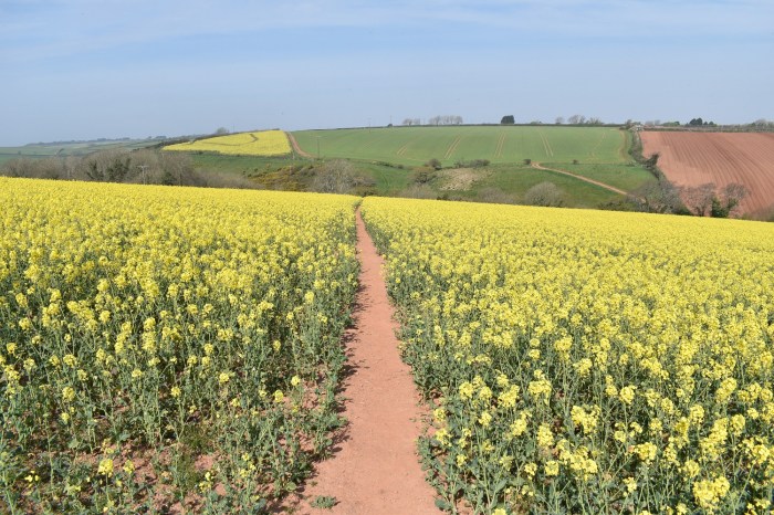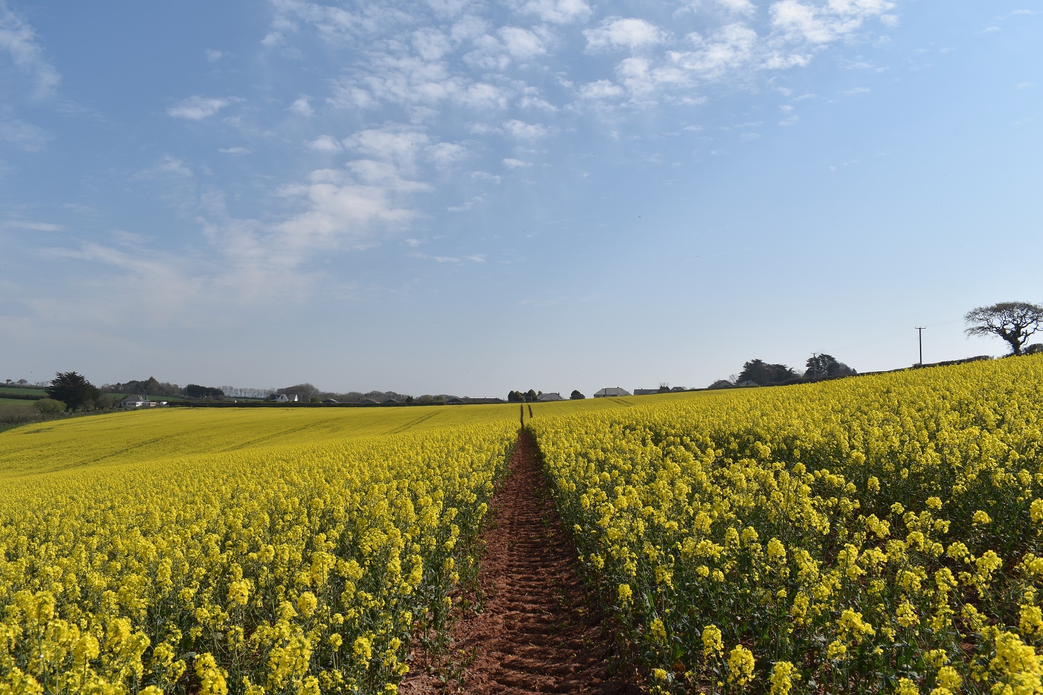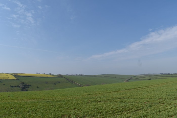 Blue skies ahead. You can see a white house above the yellow rape seed field. I’m heading for there as that is Hollacombe